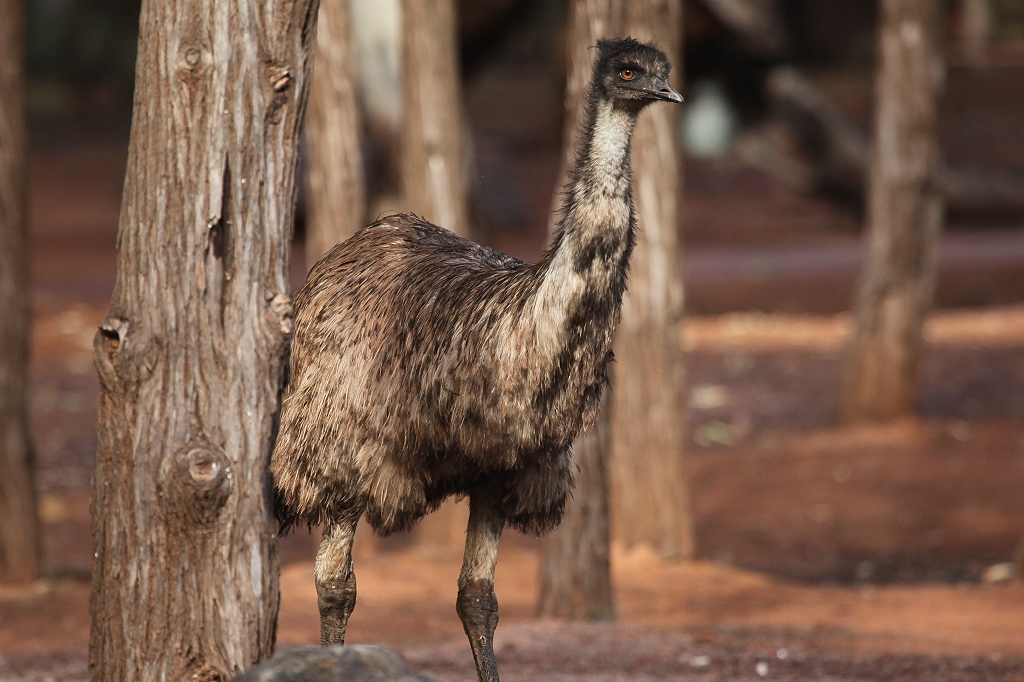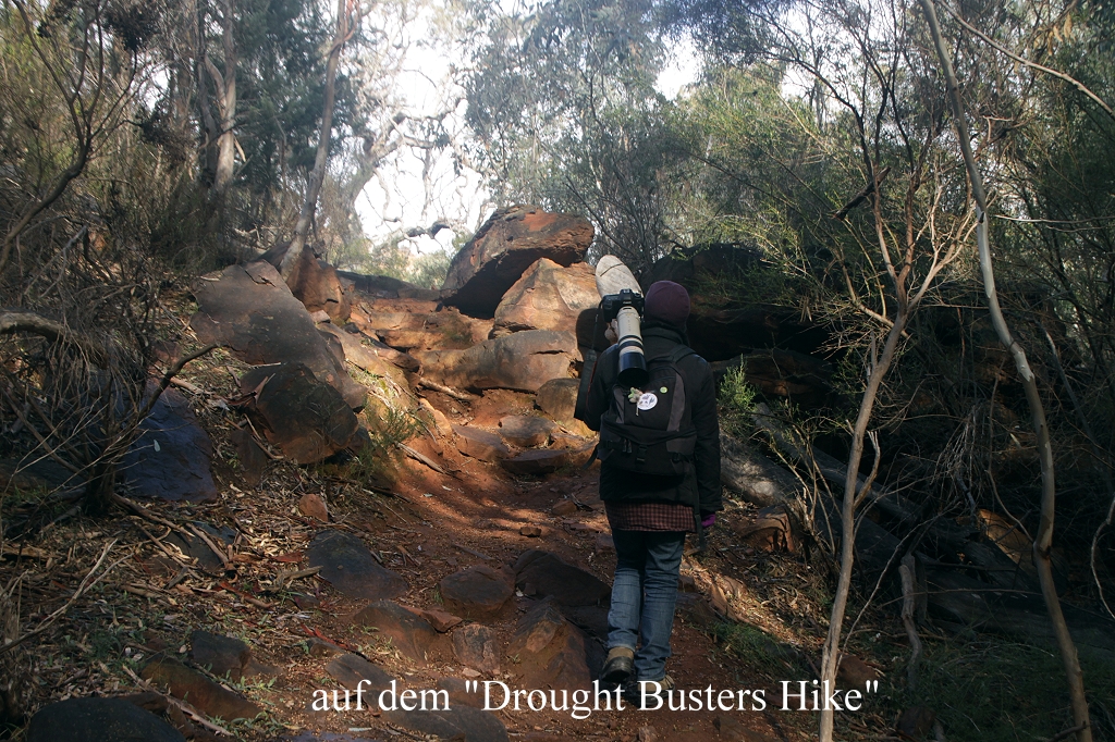 Wir entschieden uns für den "Drought Busters Hike", einen insgesamt 3,5 km langen Rundweg, der aus dem Tal auf 600 m Höhe hinauf und dann in einer Schleife wieder zurückführte. Gleich zu Anfang wurden wir von einigen Emus mit Nachwuchs in Augenschein genommen, die aber ruhig am Boden pickend weiter zogen. |