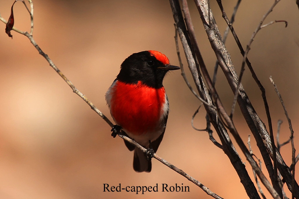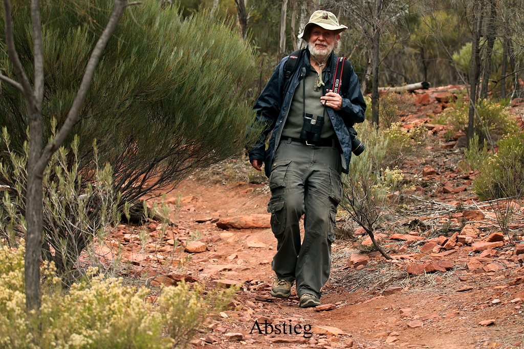 Um 10.15 Uhr hörten wir nach langer Zeit mal wieder den lachenden Ruf eines Kookaburra aus der Ferne. Auch einen Red-capped Robin und einen White-plumed Honeyeater bekamen wir zu Gesicht. Beim weiteren Anstieg verließen wir die dichte Population von alten Eukalyptusbäumen. |