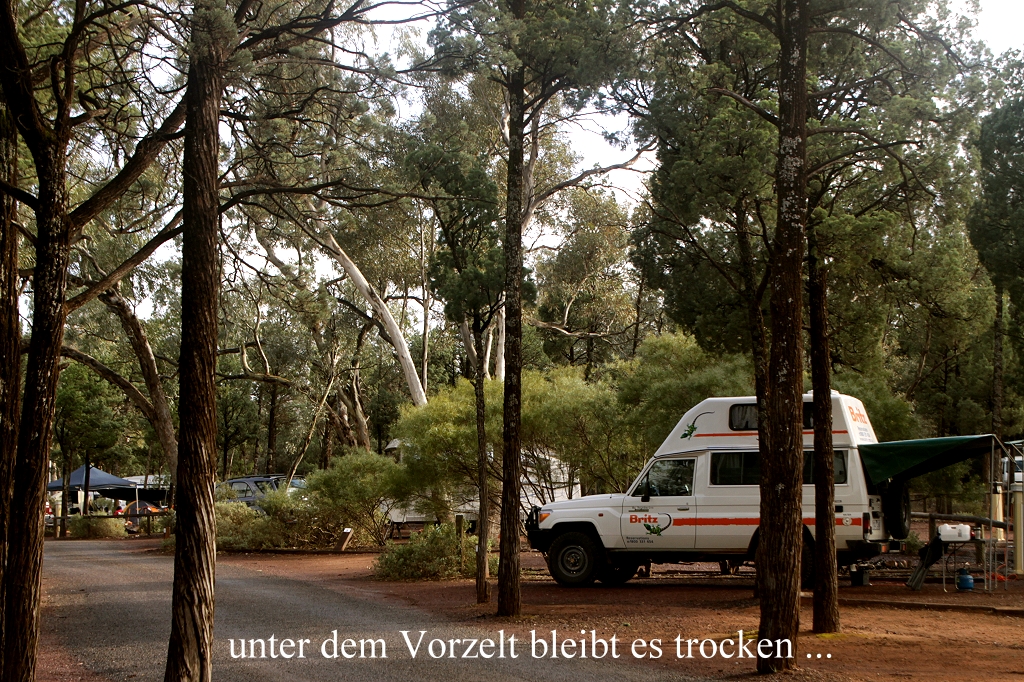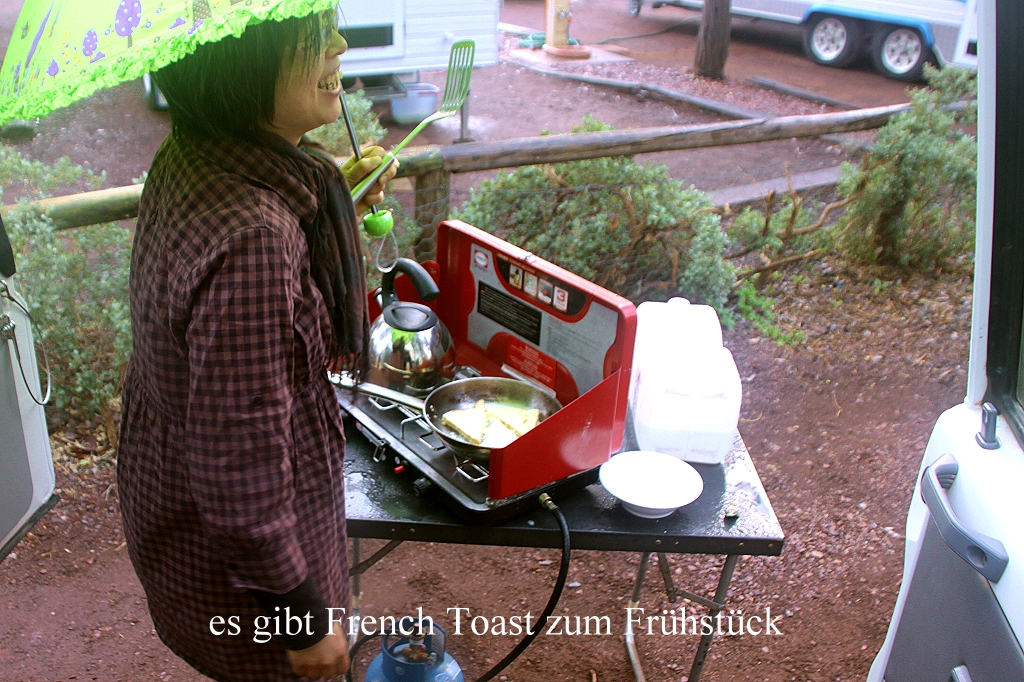 So zwischen 6.15 und 6.30 Uhr wurden wir wach. Ein Blick aus dem Fenster verhieß leider nichts Gutes. Es war zwar noch ziemlich dunkel, aber der Himmel war grau in grau. Ein ganz feiner Nieselregen sprühte vom Himmel, der alles ziemlich schnell durchnässte. Da wir unsere Plane draußen noch nicht aufgespannt hatten, machte Tomoko das Frühstück unter ihrem grünen Schirm. Es gab wieder 2 Spiegeleier mit Schinken und Toast für mich, und Tomoko bereitete sich wieder ein Sandwich. Der heiße Kaffee tat gut zu dieser frühen Morgenstunde, noch dazu bei diesem scheußlichen nasskalten Wetter. Tomoko machte zusätzlich sogar noch einen French Toast, der eine willkommene Abwechslung in den Speiseplan brachte. Ein ganzer Schwarm Apostelbirds besuchte uns sowie einige Miners und Magpies, die alle darauf warteten, vielleicht einige Krümel ergattern zu können. Einem Magpie gelang es schließlich die Reste unseres Spiegeleis zu picken, die Tomoko aus der Pfanne beim Spülen gekratzt hatte. Anschließend brachte ich die Zeltplane über der hinteren Autotür an, was den trockenen Bereich doch um einiges erweiterte. |