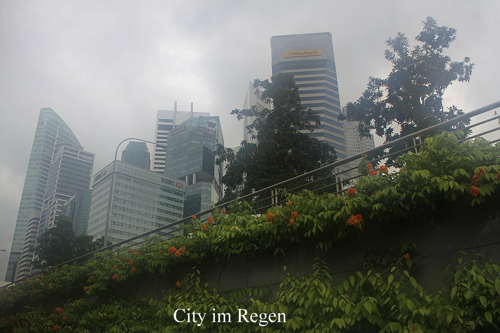 Während wir den genossen, wurde der Regen plötzlich sehr intensiv, so dass viele Leute fluchtartig Schutz suchten. Wir blieben etwa eine halbe Stunde sitzen, bis es wieder aufhörte zu regnen. Die Sonne setzte sich wieder durch und die extrem feuchte tropische Luft brachte mich gehörig ins Schwitzen. Am Luxus Hotel "Fullerton" vorbei gehend, suchten wir die nächste U-Bahn Station "Raffles Place", die wir auch nach einigem Suchen fanden. |