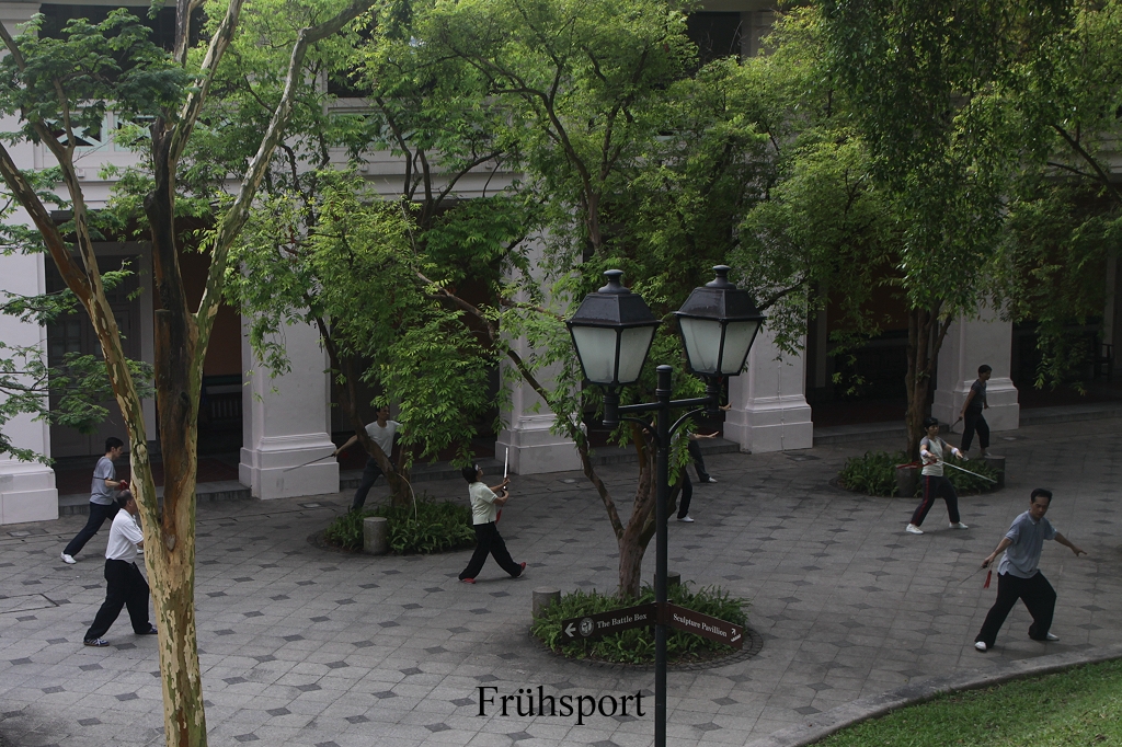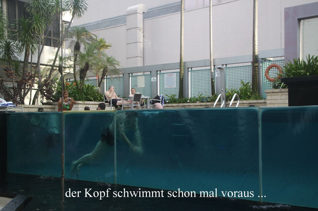 Da das Wetter inzwischen sehr sonnig war, nutzte ich die Gelegenheit für einen Besuch des Swimmingpools, der im 4.Stock lag mit herrlichem Blick auf den gegenüberliegenden "Fort-Canning-Park". Hier blieb ich 2 Stunden und las die Tageszeitung, immer wieder unterbrochen von ein paar Längen Schwimmen im Pool. |