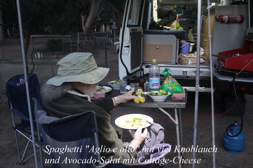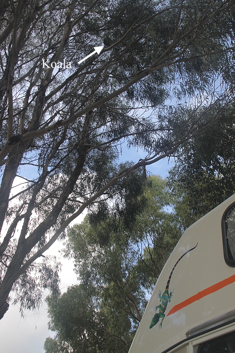 Gegen 7:00 Uhr wurden wir wach nach erholsamem Schlaf. Es hatte in der Nacht zwar wieder geregnet, doch jetzt war es trocken. Also bereiteten wir unser Frühstück draußen vor. Eine Frau, die hier dauerhaft auf dem Campingplatz lebt, zeigte uns direkt über uns einen Koala hoch im Baum sitzend. |