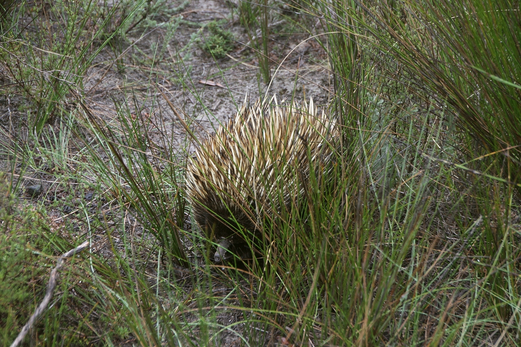 Als ich vorsichtig zurückfuhr, flog der Kite weiter. Tomoko schaffte es aber, ein Bild von ihm im Flug zu machen. Das Fahren bei wenig Verkehr ermüdete etwas. Etwa 10 km vor unserem Ziel, entdeckte ich im Vorbeifahren einen Echidna, ein in Australien heimisches igelähnliches Stacheltier. Schnell hielt ich an, doch beim Zurücksetzen war er zunächst verschwunden. Tomoko suchte aufmerksam die Büsche ab und tatsächlich entdeckte sie ihn wieder. |