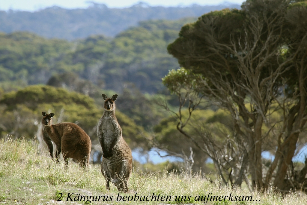 Endlich waren wir am Ziel, dem Western KI Caravan Park. Ich erledigte die Formalitäten, während Tomoko die Gastküche inspizierte. Ich buchte erst mal für drei Nächte (28 AUS$ pro Nacht) und ging nach draußen. Tomoko, im Küchenbereich stehend, winkte mir zu. Da stand doch tatsächlich ein Känguru, das neugierig zu mir kam, so dass ich es streicheln konnte. |