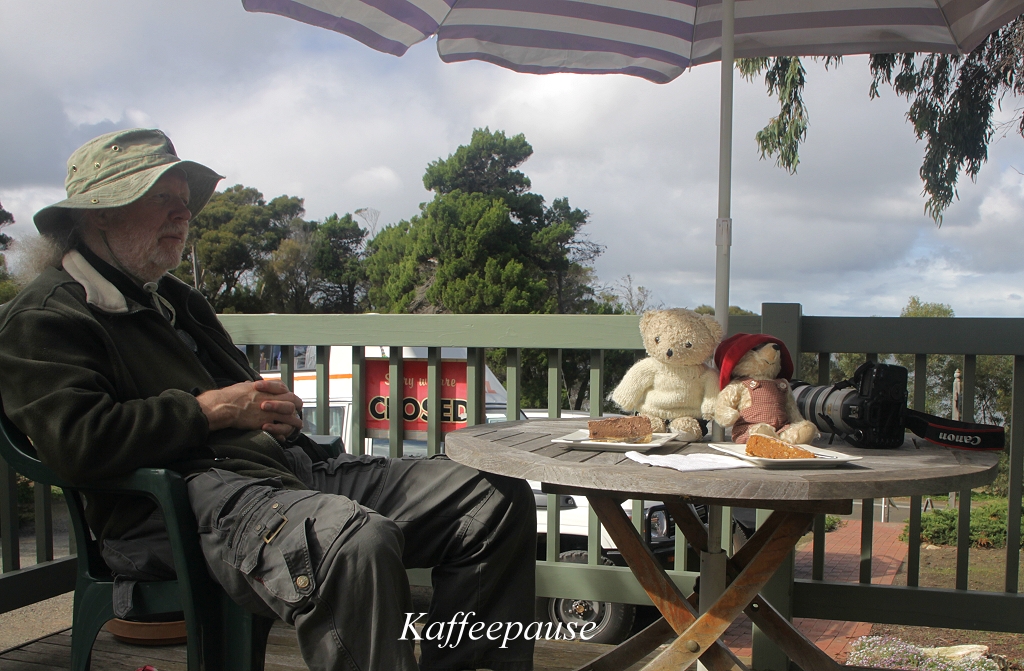 Auch einige Wallabies hüpften herum. Nachdem wir eine gute 3/4tel Stunde umhergegangen waren, fing mein Knie wieder an zu schmerzen. Der erste Baumstumpf, auf dem ich mich etwas hinsetzen wollte, war voller Ameisen, also keine so gute Idee. Etwas weiter gab es dann eine bessere Gelegenheit. Da wir uns aber auf einen Kaffee freuten, gingen wir zurück zum Eingang ins dortige Café. Dort kauften wir uns je einen Cappuccino und ein Stück Kuchen, beides gut, aber recht teuer (17,- AUS$ zusammen). |