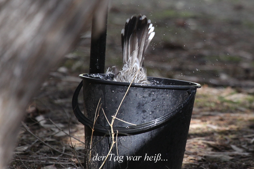 Später erfuhren wir, dass dieses Tier ohne Eltern war und von den Caravanpark-Besitzern mit der Milchflasche aufgezogen worden war. Wir konnten uns einen Stellplatz auswählen, wiederum mit Stromanschluss. Langsam machten wir eine Runde mit dem Auto und suchten nach einem geeigneten Stellplatz. Tomoko sah dabei einen Red Wattlebird, der gerade ein Bad nahm. |