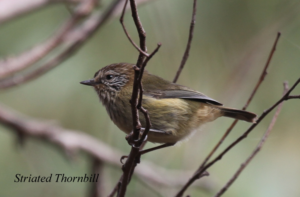 Wir stiegen aus um ein paar Fotos zu machen. Es war etwas schwierig, denn immer, wenn die Kamera klickte, versteckte sich das Tier schnell unter einem Grasbüschel und blieb regungslos für eine Weile. Wir gingen vorsichtig etwas voraus und tatsächlich folgte er uns, so dass wir doch noch zu unseren Fotos kamen. Wir fuhren weiter. Immer mehr Kängurus und Wallabies tauchten auf sowie ein Vögelchen, das wir später als Olive Whistler identifizierten. |