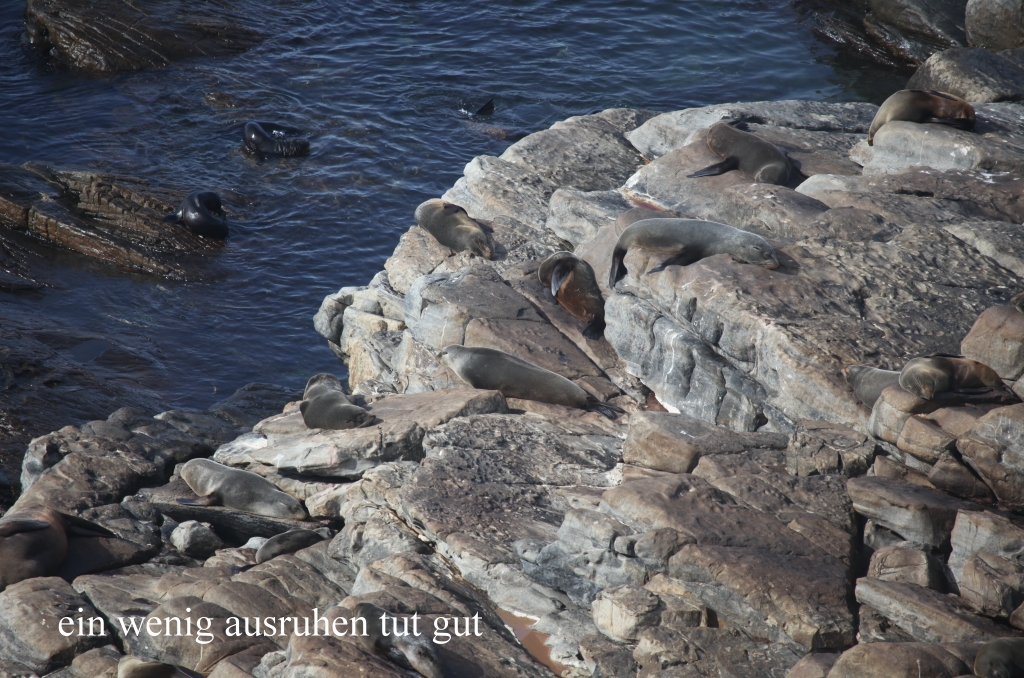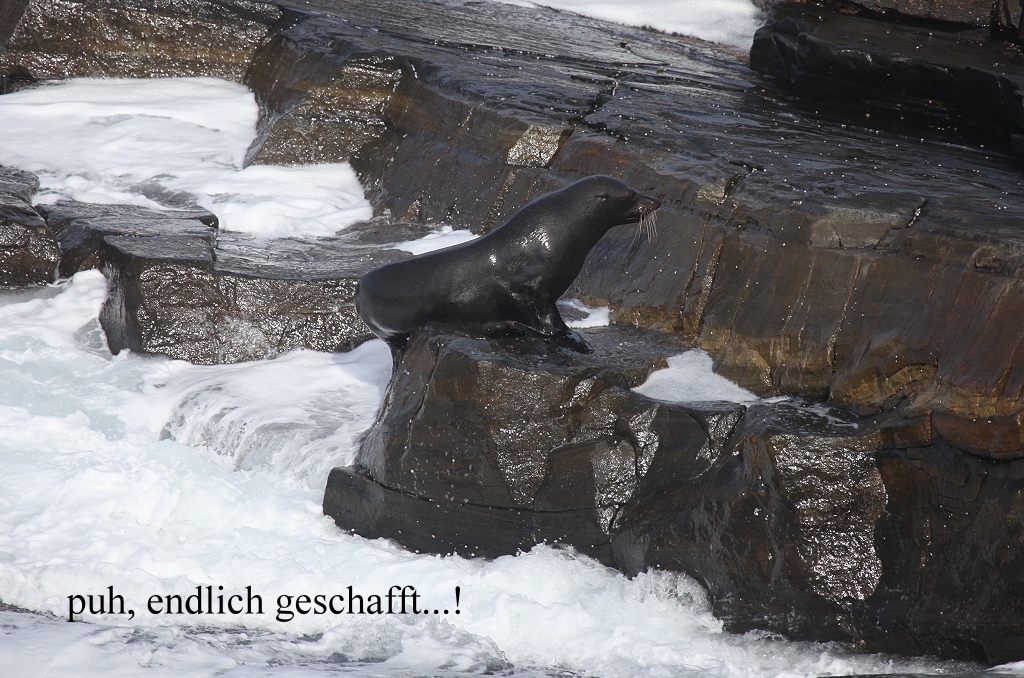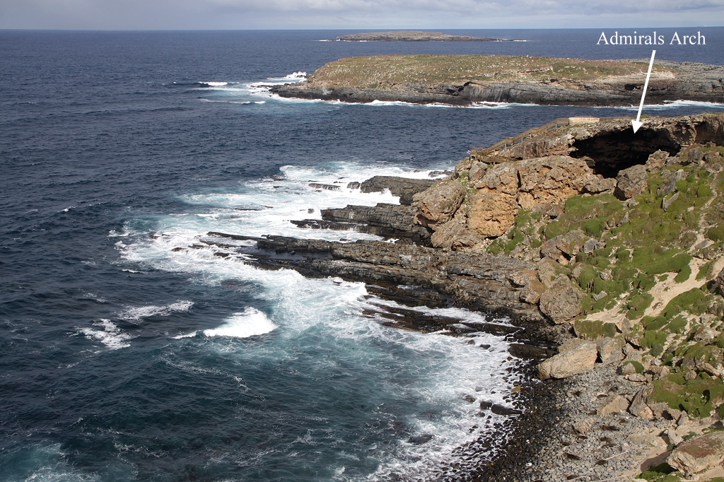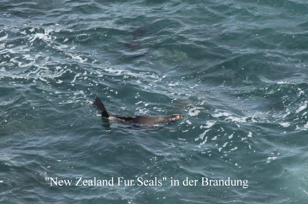 Ich machte von hier aus einige Fotos und ging dann zurück aus Sorge, dass Tomoko sich vielleicht in dem Gewirr von kleinen Wegen und Pfaden verlaufen könnte. Sie kam mir aber fröhlich entgegen und hatte offensichtlich kein Problem. Nun fuhren wir zurück. Die Wolken über dem Admirals Arch hatten sich inzwischen verzogen und als wir dort ankamen, blies zwar ein frischer Wind vom Meer her, es schien jedoch die Sonne. Der Admirals Arch ist ein natürlicher Felsbogen, der direkt unten an der westlichen Landspitze von Kangaroo Island liegt. Am Parkplatz angekommen, gingen wir zunächst etwa 200 m nach links bis zu einer Stelle, von der man aus gut 100 m Höhe einen guten Blick aufs offene Meer und die tosende Brandung hatte. Einige Robben (New Zealand Fur Seals) lagen faul in der Sonne auf großen runden Felsbrocken. Andere wiederum tauchten im offenen Meer. Beim Zurückkommen nutzten sie geschickt die heftige Brandung aus.