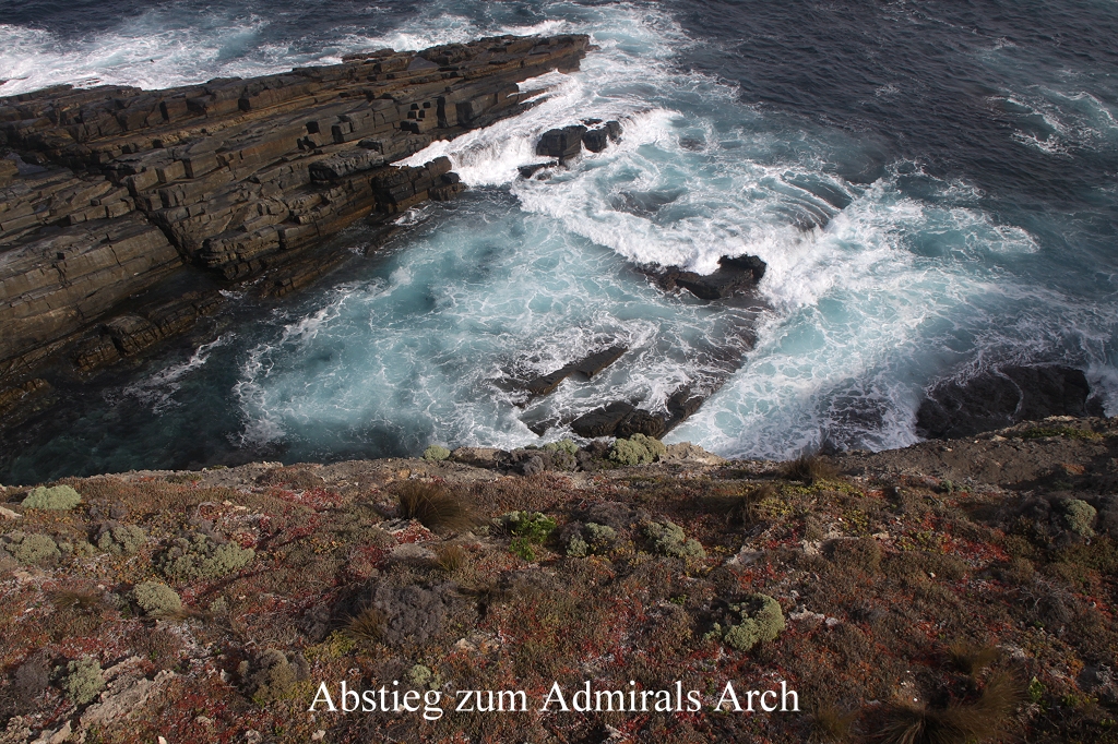 Ein Mensch würde sich bei einem solchen Vorgehen sicher alle Knochen zwischen den Felsen brechen. Nachdem wir genug gesehen hatten, gingen wir zum Parkplatz zurück. Ein gut ausgebauter Holzsteg, Rollstuhl geeignet, führte nach unten. Dort angekommen hatten wir einen tollen Blick durch den Admirals Arch aufs Meer.