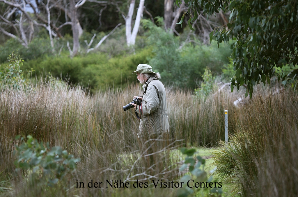 Anschließend fuhren wieder zum Visitor-Center. Beim Aussteigen hörte Tomoko ein merkwürdiges Geräusch, das an ein Knarren von Ästen im Wind erinnerte. Doch die angeblichen Äste entpuppten sich sehr schnell als das Kreischen eines Papageis (Gang Gang Cockatoo), der hoch über unseren Köpfen im Wipfel eines Baumes saß. Sein leuchtend roter Kopf war deutlich auszumachen. Tomoko hatte diesen Vogel vor 4 Jahren schon vergeblich in den Blue Mountains gesucht. Sie konnte gerade noch ein paar Fotos machen, als der Vogel auch schon wieder weiterflog. Beim Anschauen der Bilder stellte Tomoko mit Erschrecken fest, dass die Kamera beim Lagern auf dem Autositz ihre Einstellung selbständig verändert hatte, so dass das Ergebnis leider total verfälscht war, schade. Wir gingen ins naheliegende Café und trösteten uns mit einem Stück Carrot-Cake und einem wohlschmeckenden Cappuccino (zusammen 15 $). Da es noch relativ früh war gegen 15.30 Uhr, machten wir noch eine kleine Runde in die nähere Umgebung. Zahlreiche Gänse sowie Wallabies und Kängurus bevölkerten die sumpfige Graslandschaft. Einige Gänse segelten im Tiefflug laut schreiend dicht über unsere Köpfe hinweg.