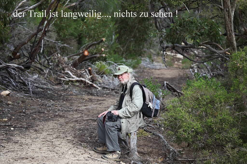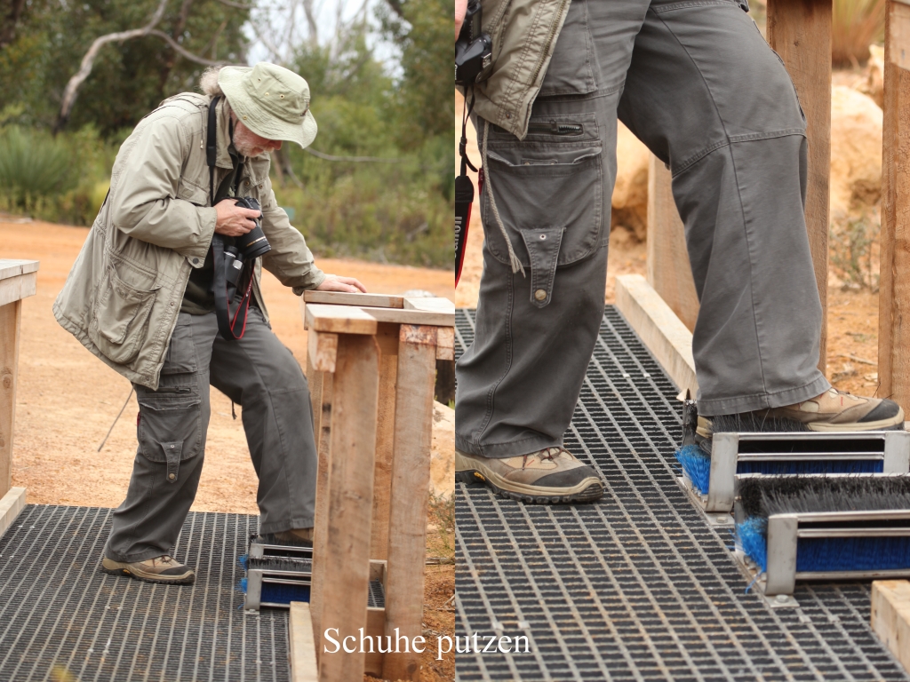 Nach einer Viertelstunde erreichten wir um 13.40 Uhr das Ende der Straße. Am Anfang des Trails, bei einem kleinen Holzbrückchen waren am Boden zwei Bürsten befestigt, mit denen man seine Wanderschuhe bei Rückkehr säubern konnte, sehr praktisch… Wie wir später lernten, war der Grund für diese Bürsten nicht, dass man mit sauberen Schuhen wieder ins Auto kommt, sondern dass durch gründliches Säubern dafür gesorgt werden soll, dass man nach einer Wanderung am Schuh haftende, für Pflanzen schädliche Pilzsporen, nach Möglichkeit nicht weiterverbreitet. Wir trennten uns, da ich wieder etwas marschieren wollte und Tomoko lieber langsam nach Vögeln Ausschau halten wollte. Es war aber ziemlich still. Am Rande des Weges standen immer wieder Yakka-Pflanzen, deren strahlenförmige dünne Blätter mich durch ihre strenge Regelmäßigkeit immer wieder faszinierten. Der sandige Pfad führte durch dichtes Eukalyptus-Gehölz Richtung Küste. Da aber außer ein paar kleinen Vögelchen (Thornbills) nicht viel zu sehen war, kehrten wir wieder um nach 20 min.