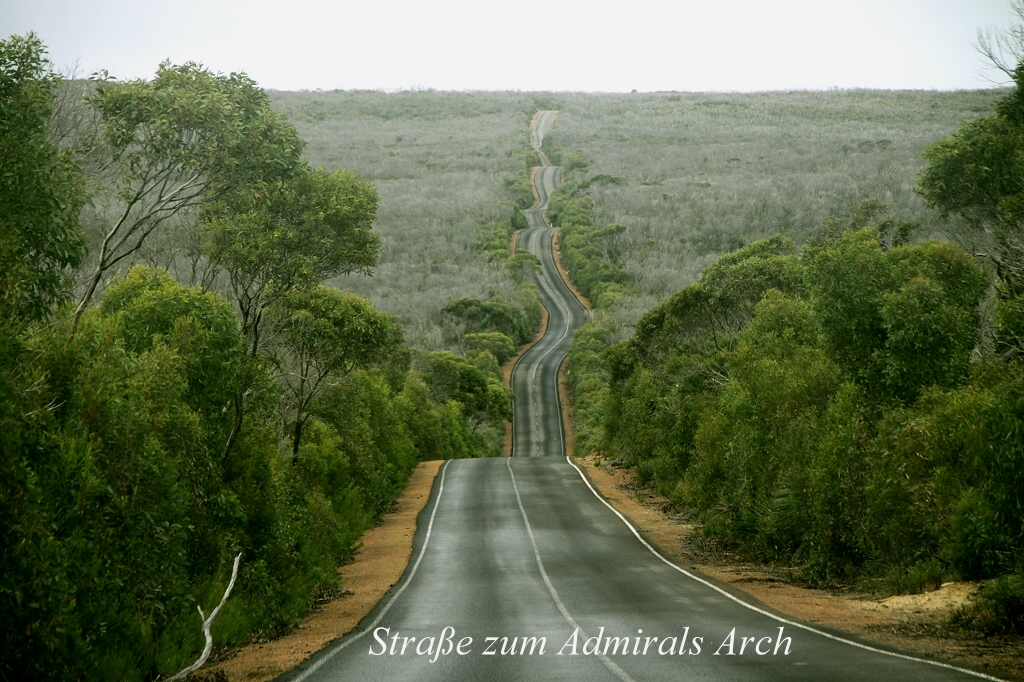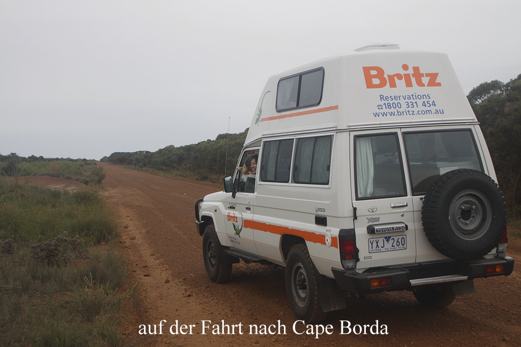 Tomoko holte die Videokamera und filmte die Szene. Auch ich kam bald darauf hinzu und übernahm die weitere Aufnahme, so dass sie wieder ihre Fotokamera in die Hand nehmen konnte. Es war ziemlich kalt, etwa 11°. Die Sonne versteckte sich hinter dichten Wolken. Ein heißer Kaffee musste her. Also bereiteten wir schnell das Frühstück vor. Ich aß wie immer zwei Scheiben Brot, eine mit Käse, die andere mit Marmelade. Tomoko hatte sich wieder Cornflakes mit diesmal Sojamilch gemacht, schmeckte beides sehr gut. Da wir heute mit dem Auto in den Flinders Chase Nationalpark fahren wollten, musste ich die Markise wieder abbauen und Gasherd und Campingmöbel unter der Plane zusammenstellen. Nachdem wir fertig waren, fuhren wir die 5 km bis zum Eingang des Nationalparks. Beim Visitor- Center bezahlten wir 20 $ für den Eintritt und fuhren weiter. Bis zum Admirals Arch waren es 15 km. Kurz bevor wir dort ankamen wurden die Wolken immer dichter und es fing an leicht zu regnen. Also änderten wir kurz entschlossen unsere Richtung und bogen links ab Richtung Remarkable Rocks, die wir nach ungefähr 3 km erreichten. Kurz vorher machten wir noch einen kurzen Stop, da man von hier eine tolle Aussicht hatte. Plötzlich entdeckte ich auf der Stoßstange des Autos 3 kleine Kügelchen. Da hatte uns doch tatsächlich offensichtlich ein Possum in der Nacht etwas hinterlassen, ohne dass wir etwas bemerkt hatten. Entelchen inspizierte das Ganze sehr aufmerksam.