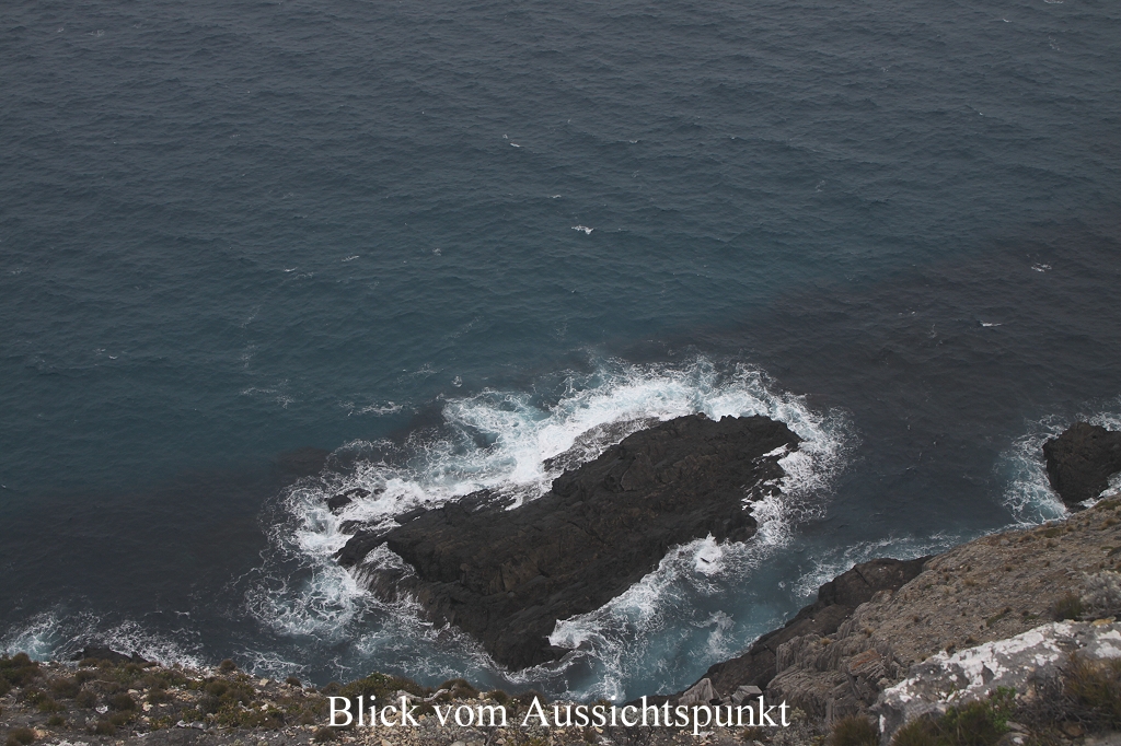 Als wir anhielten und ausstiegen, flüchtete er schnell in die angrenzenden Büsche. Kurz vor 11.00 Uhr kamen wir am Leuchtturm von Cape Borda an. Wir parkten unser Auto und machten uns erst mal mit einem Lageplan vertraut. Es gab drei Trails, von denen einer gesperrt war. Da ich ein paar Schritte nach der langen Fahrt gehen wollte, wählten wir den Cliff Hike, einen kleinen Pfad der 500 m durch die kargen Büsche zum Meer führte. Einige Kängurus waren in der Nähe zu sehen. Auf halbem Wege blieb Tomoko stehen. Sie wollte doch lieber bei den Kängurus bleiben und dabei vielleicht noch ein paar Vögel entdecken. Ich marschierte weiter und kam nach etwa 10 min an einer kleinen Aussichtsplattform etwa 50m über dem Meer an.