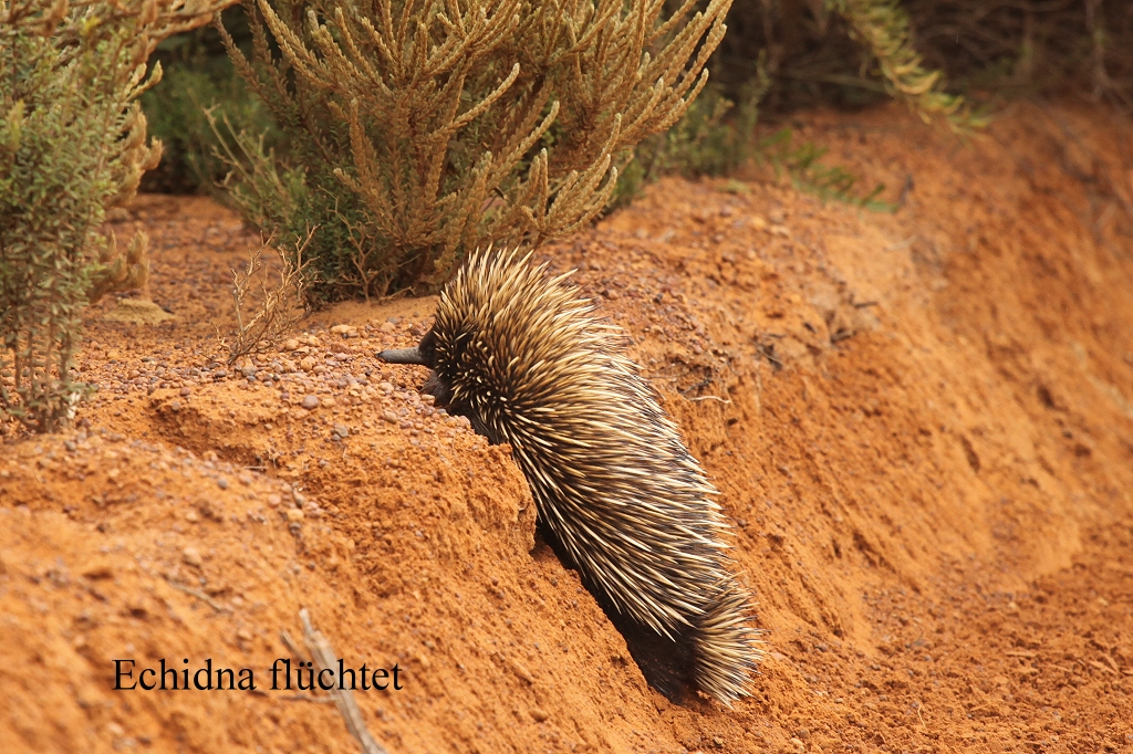 Um 10:45 Uhr kreuzte etwa 50 m vor uns ein Tier die Fahrbahn. Im ersten Augenblick dachten wir an ein Wombat, ein in Australien heimisches Tier. Doch schnell erkannten wir, dass es sich um einen Echidna handelte, ein Stacheltier, das wir vor drei Tagen schon einmal gesehen hatten.