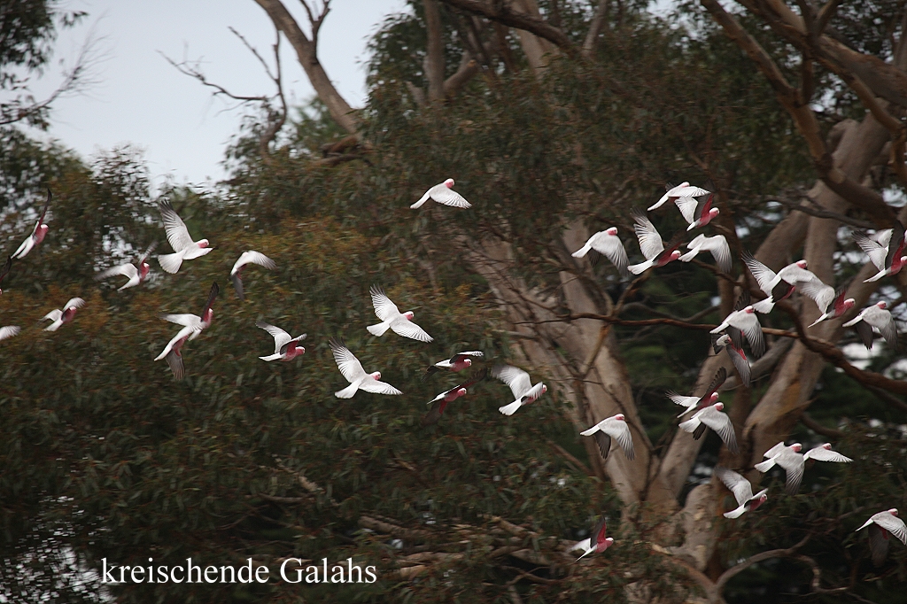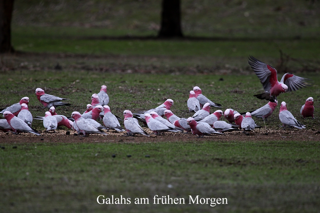Wir sind heute etwas später wach geworden, erst um 7:15 Uhr. Das Wetter war bewölkt aber nicht ganz so kalt. Um 8:00 Uhr frühstückten wir. Unser kleiner Koala hatte seinen Baum wieder gewechselt. Tomoko ging mit ihrer Kamera los um einen großen Schwarm Papageien (Galahs) zu fotografieren. Es waren so an die 100 Stück, die auf einer nahen Wiese nach Futter suchten und sich nach einer Weile kreischend in die Luft erhoben.