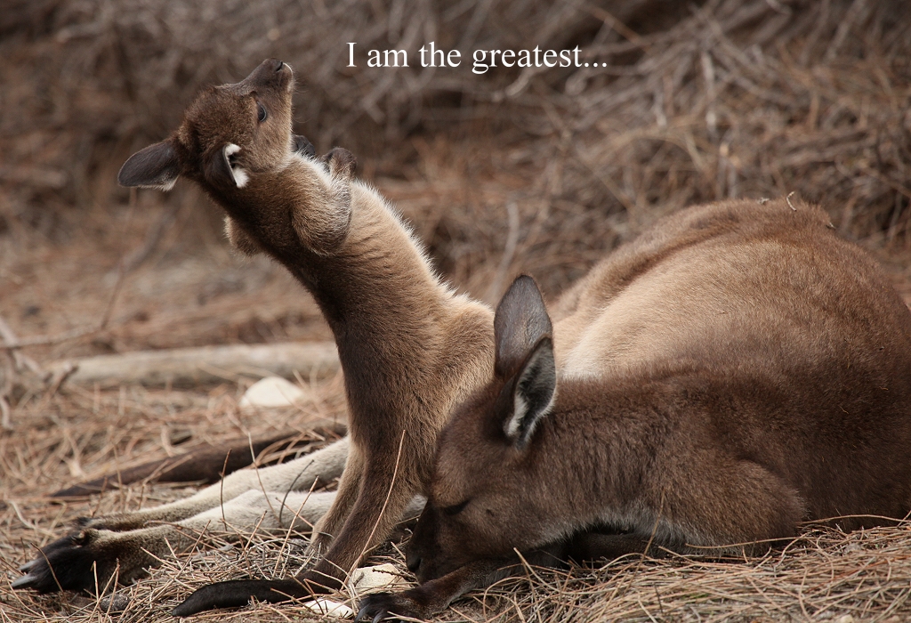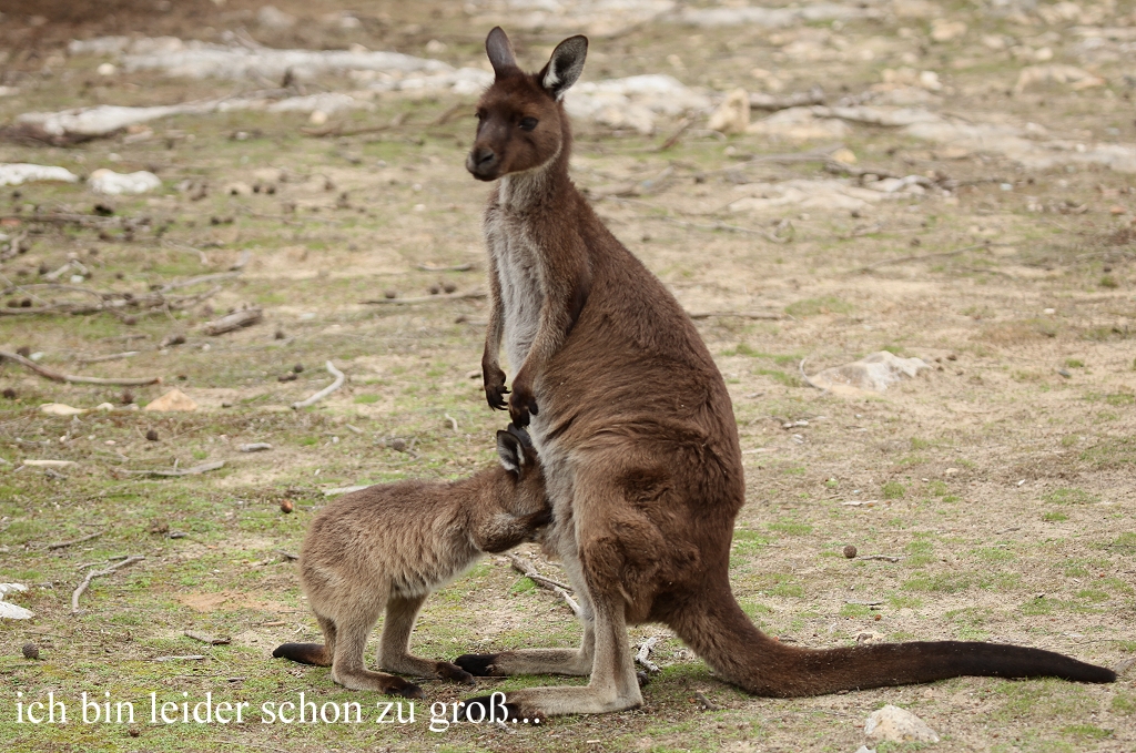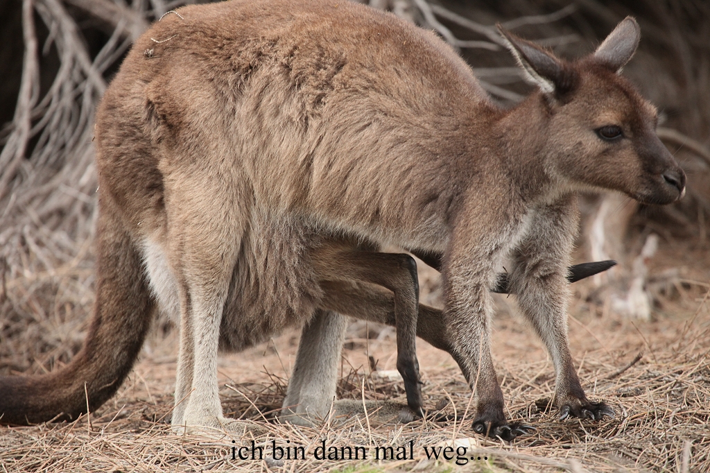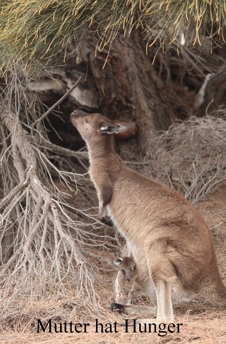 Hier fegte ein äußerst starker Wind vom Meer über die Klippen in mein Gesicht, der mich frösteln ließ. Schnell machte ich ein paar Fotos und kehrte dann um. Mit dem Wind im Rücken kam ich gut die Steigung hinauf und war nach 15 min wieder bei Tomoko. Die stand inzwischen bei den Kängurus und fotografierte eifrig. Einige Kängurus hatten Junge. Bei einem sah man deutlich den dicken Hängebauch, in dem sich etwas bewegte. Ich holte schnell meine Videokamera aus dem Auto und kam gerade noch rechtzeitig um zu sehen, wie ein kleines Känguru den Beutel seiner Mutter verließ. Das war wirklich süß anzusehen, wie das kleine tapsig herumstapfte und immer wieder versuchte bei der Mutter zu trinken. Ein Video kann man hier sehen: Kängurus