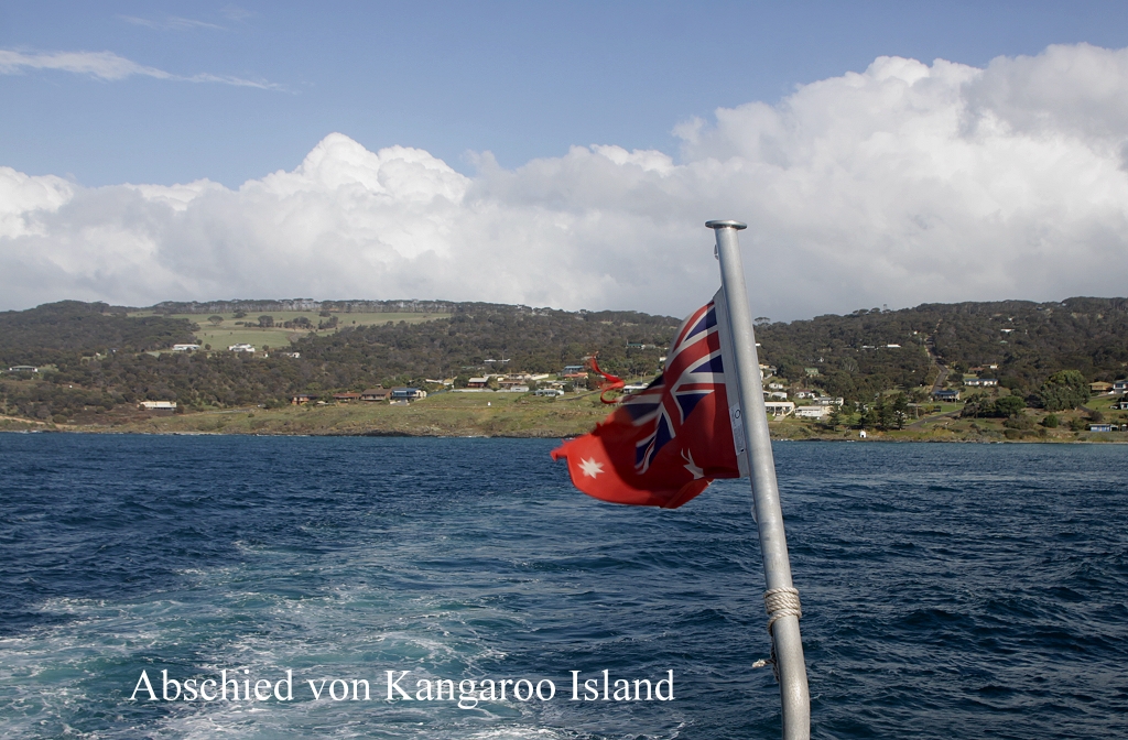Pünktlich um 14.00 Uhr erreichten wir die Abfahrtsstelle der Fähre, die uns wieder aufs Festland bringen sollte. In einem nahen Supermarkt mussten wir Entelchen enttäuschen, es gab leider kein Bier zu kaufen, aber übermorgen in Adelaide, versprochen. Das Beladen der Fähre ging schleppend voran, da einige schwere Lastwagen mit langen Hängern rückwärts auf die Fähre rangieren mussten. Endlich war auch ich dran. Auch ich wieder rückwärts, was inzwischen tadellos klappte. |
