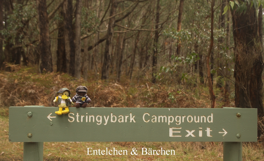 Wir wanderten langsam unter den hohen Bäumen entlang und nach insgesamt 2 ½ Stunden und 4,5 km waren wir mit müden Beinen um 11.15 Uhr wieder zurück am Campingplatz, wo wir von einem am Boden sitzenden Kookaburra begrüßt wurden. Tomoko machte gleich mal Wasser heiß für Tee und Kaffee, was unsere Lebensgeister wieder weckte. Ich begann schon mal mit meinem Tagebuch. Währenddessen kamen weitere Kookaburras angeflogen, die sich wenig Scheu zeigend direkt neben uns niederließen. |