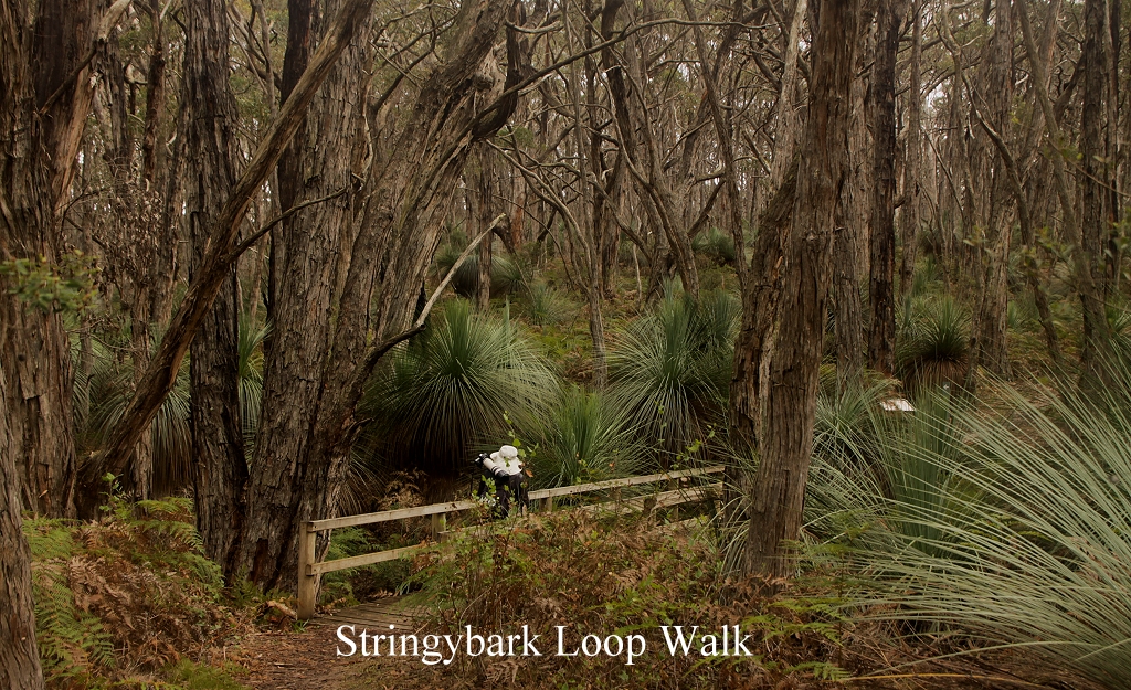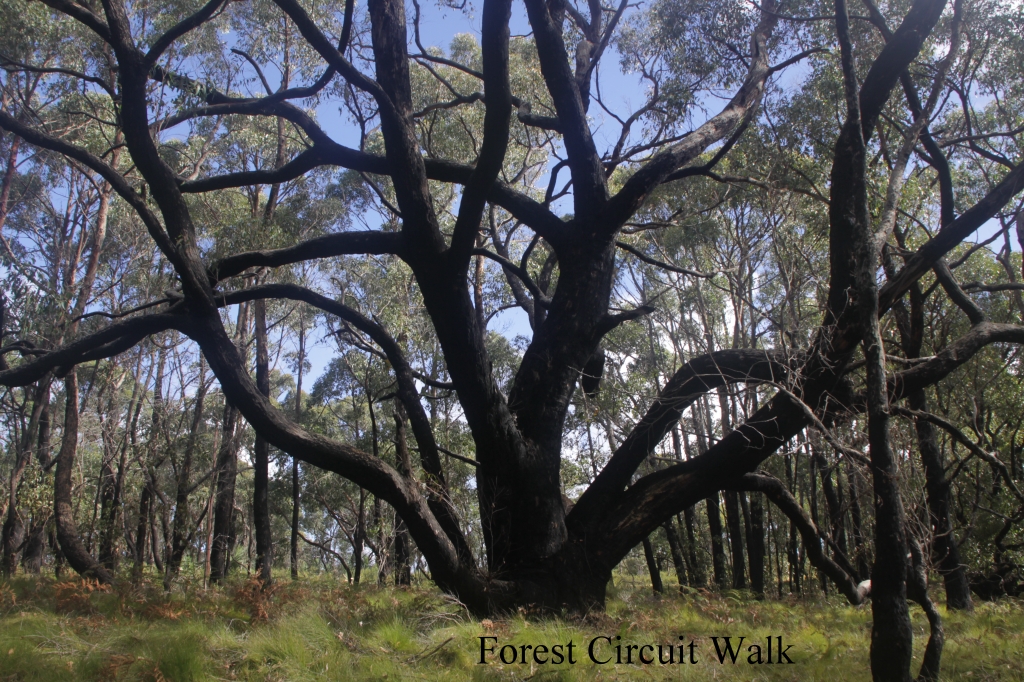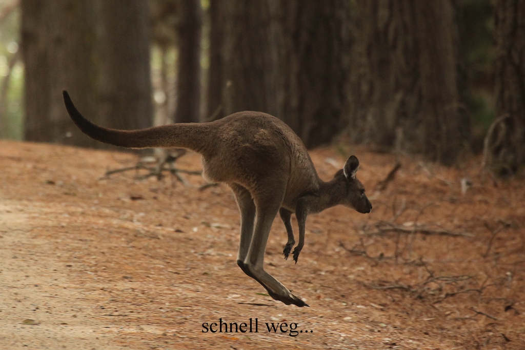Das Wetter hatte erstaunlich gut gehalten, allerdings so richtig warm wurde es nicht, nur so um die 15°. Wir blieben eine Weile gemütlich sitzen, aßen Donut und Carrot Cake und ließen uns von der Sonne bescheinen. Um 13.45 Uhr hatten wir Lust auf einen weiteren Spaziergang. Diesmal gingen wir Richtung Westen, wo ein 2,5 km langer Rundweg abzweigte. Auch der schlängelte sich wieder durch alte Bäume, die aber deutlich lichter standen, so dass die doch recht kräftige Sonne uns ins Gesicht schien. Die Bäume hatten alle ziemlich verkohlte Stämme. Vor einigen Jahren muss hier wohl ein kräftiges Buschfeuer gewütet haben. Tomoko hatte ihren Hut vergessen und da sie auch noch Kopfweh hatte, ging sie recht schnell, so dass ich ihr kaum folgen konnte. Nach 1,25 km machte der Weg eine scharfe Rechtskurve und es ging wieder zurück, jetzt mit der Sonne im Rücken, was angenehmer war. 500 m voraus saßen 3 Kängurus auf dem Weg. Als wir uns bis auf etwa 200 m genähert hatten, sprangen sie in großen Sätzen davon. |