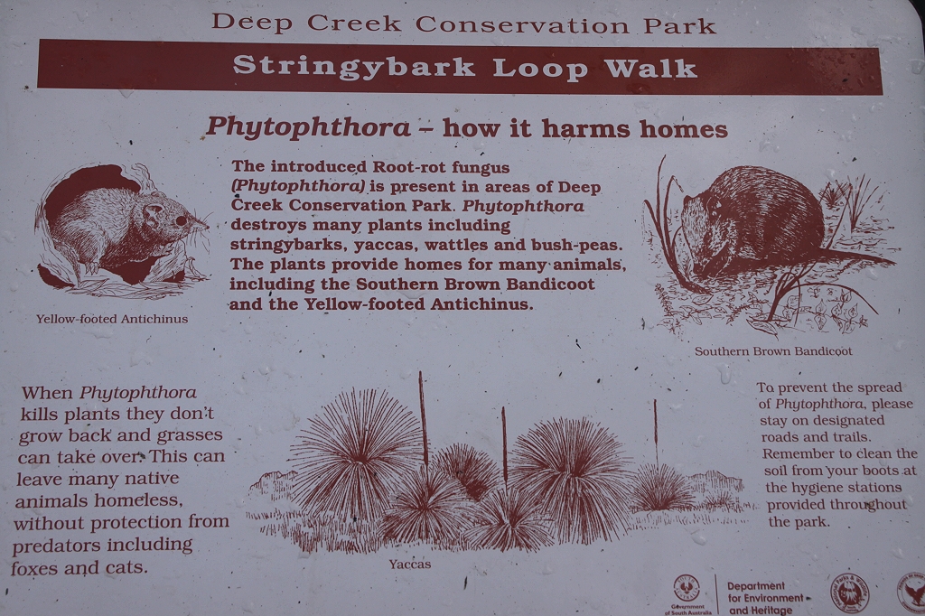 Am Weg standen immer wieder Hinweistafeln, die uns einige interessante Dinge über die Pflanzen- und Tierwelt erzählten. Bemerkenswert waren die Erläuterungen zu einem eingeschleppten schädlichen Pilz (Phytophthora), der viele Pflanzen absterben lässt. Um zu verhindern dass sich seine Sporen ausbreiten, hat man am Anfang des Trails kräftige Bürsten am Boden aufgestellt, mit deren Hilfe man seine Schuhe beim Betreten und Verlassen des Trails gründlich abbürsten soll. |