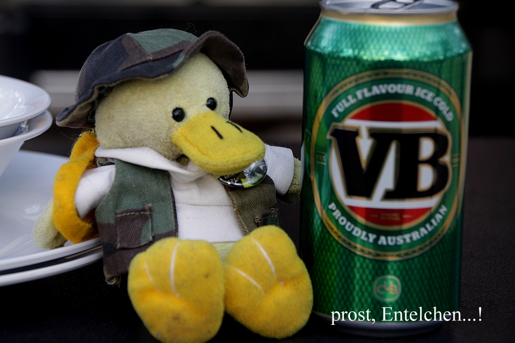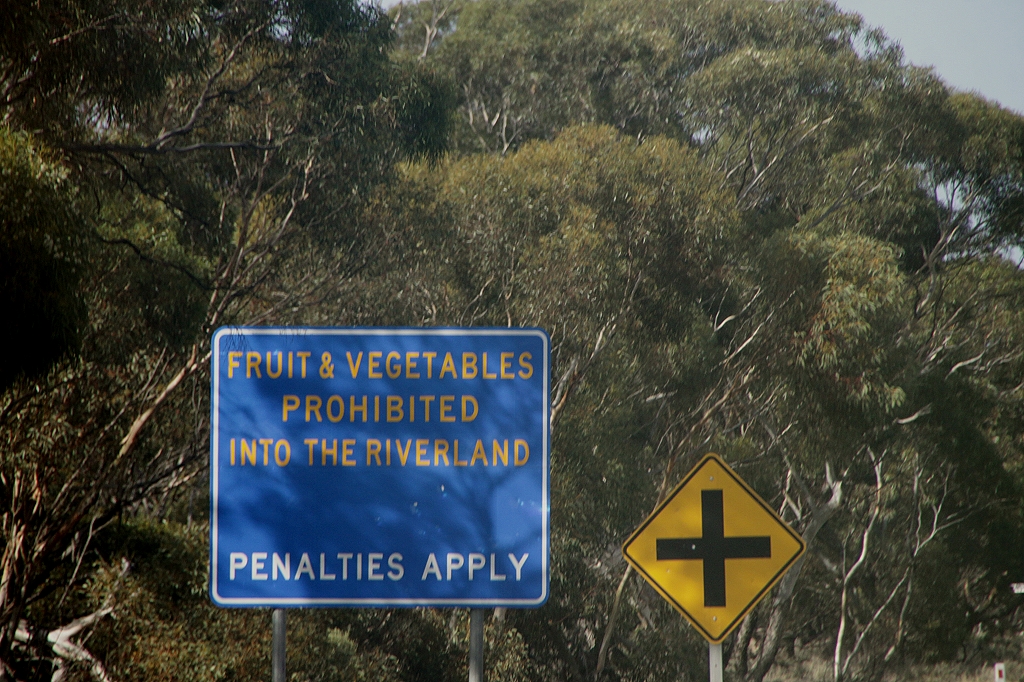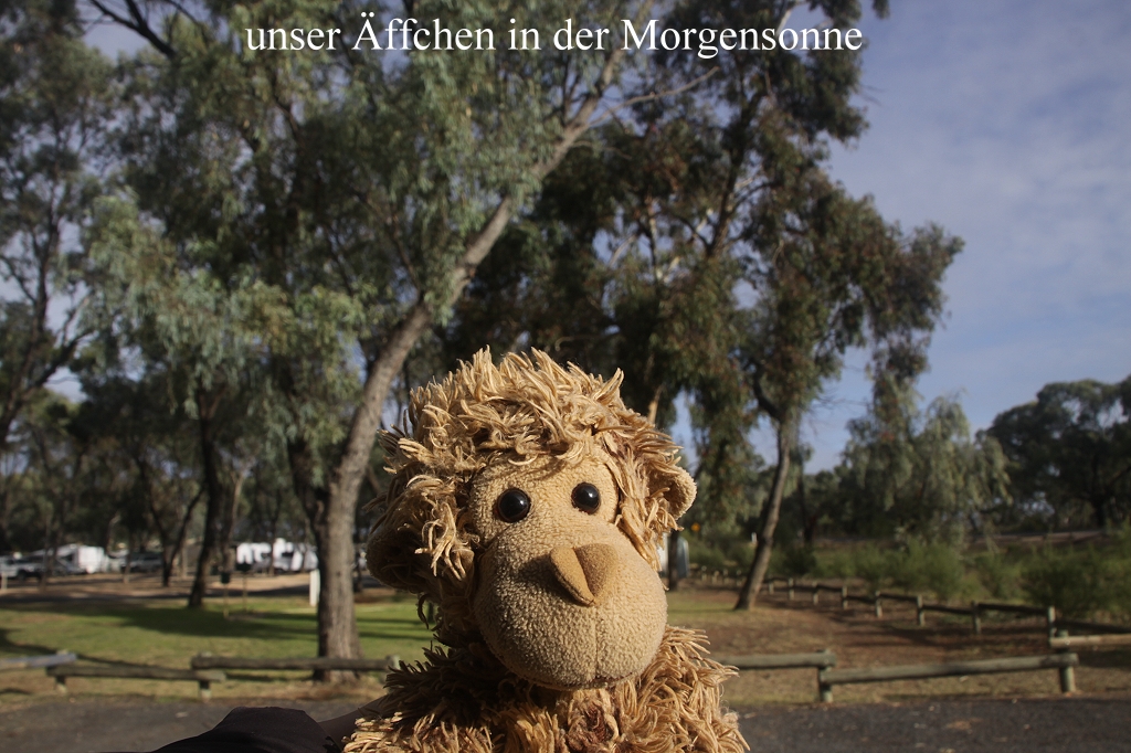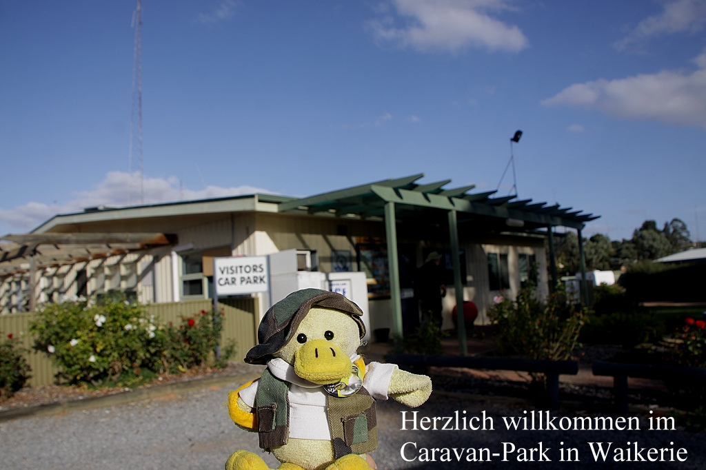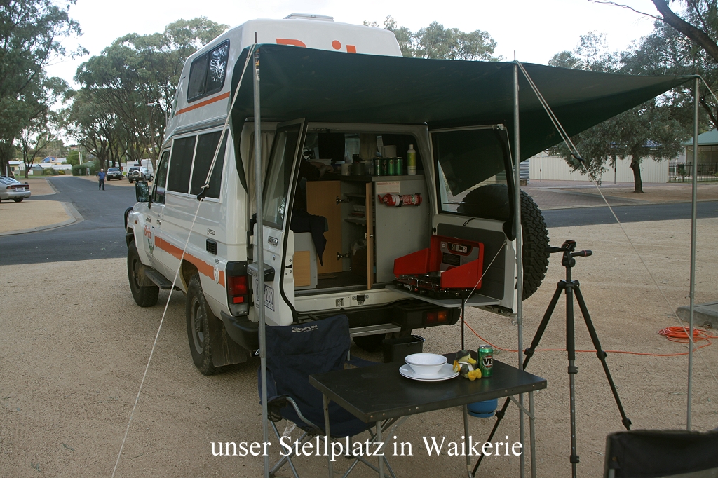 Gegen 14.35 Uhr, etwa 50 km vor Waikerie, begann eine Zone, in die man kein frisches Gemüse und Obst einführen darf. Man möchte verhindern, dass eine schädliche Insektenart, eine Fruchtfliege, eingeführt wird. Vorsorglich hatten wir unsere letzte Banane gegessen und unseren Müll in einer Mülltonne am Straßenrand entsorgt. Um 15.10 Uhr erreichten wir den Ortsrand von Waikerie. Der relativ kleine Ort liegt am Murray-River, die Gegend nennt sich Riverland. Wir durchquerten zahlreiche Orangenhaine und Weinberge. Ziemlich schnell fanden wir nach insgesamt 190 gefahrenen km den örtlichen Caravan-Park, wo wir einen Stellplatz mit Strom- und Wasseranschluss für 26,- AUS$ bekamen. Wir luden nur schnell unsere Campingmöbel aus und fuhren um 15.30 Uhr noch mal in die Stadt zurück zum Woolworth-Supermarkt, wo wir das uns noch fehlende Obst und Gemüse einkauften, das wir ja in diese Gegend nicht mitbringen durften. Als wir auch das erledigt hatten, fing Tomoko gleich mit den Vorbereitungen fürs Abendessen an, das ziemlich schnell fertig war. Es gab Pasta aglio e olio und einen großen Griechischen Bauernsalat. Vorher hatte ich mit Entelchen ein kühles Bier getrunken, das wir auch im Liquor-Store von Woolworth gekauft hatten, ziemlich teuer.