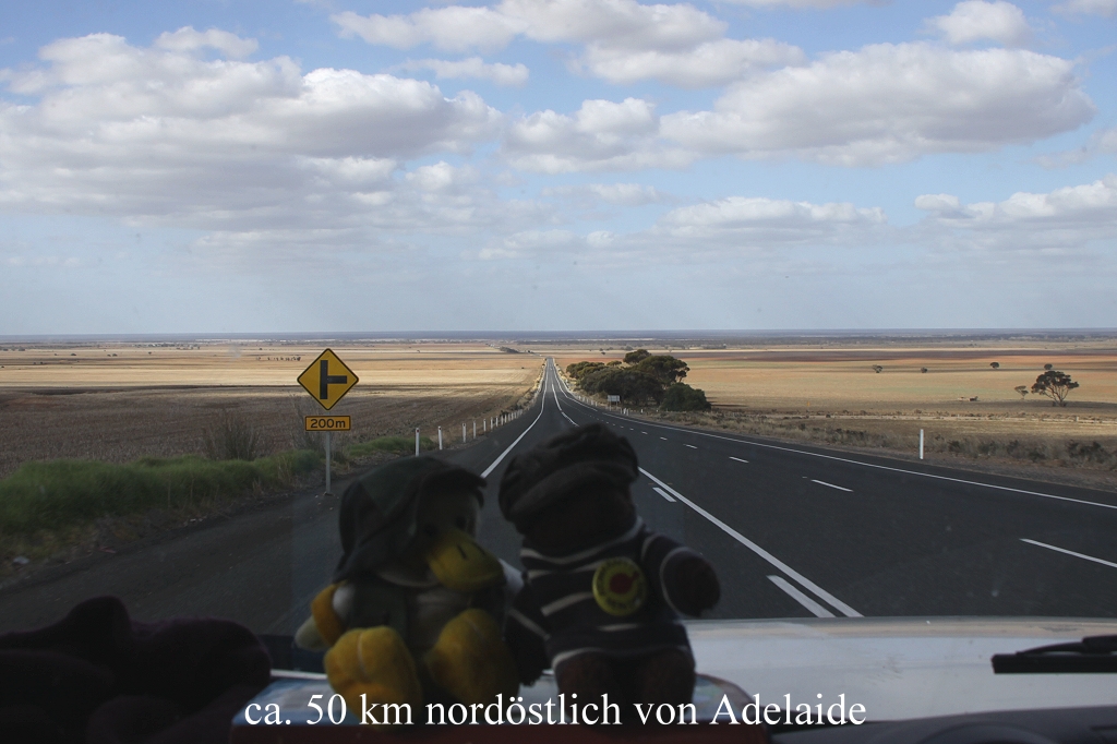 erreichten wir Adelaide. Nach einigen kleinen Missverständnissen mit unserem GPS hatten wir gegen 10.20 Uhr unseren Organic Supermarkt gefunden. Tomoko kaufte nach Herzenslust Vorräte ein (Pasta, Linsen, Polenta, Basmati-Reis Kaffee, Brot usw.), während ich mir in der Zwischenzeit einen leckeren Cappuccino gönnte. Doch auch Tomoko bekam noch Ihren Cappuccino, zusätzlich aß sie sogar noch eine Orange-Mandel-Schnitte mit Bärchen, lecker… Nun wollten wir noch in die große Shopping-Mall an der Diagonal Road. Wir hatten zunächst Schwierigkeiten diese zu finden. Ich bog trotz Tomokos Hinweis zu früh ab, aber nach einigen Wendemanövern fanden wir sie schließlich doch. Hier machten wir unsere "Morgenwanderung". Diese Mall ist einfach riesig. Trotzdem fand Tomoko alles, was sie sich vorgenommen hatte zu kaufen. Um 12.30 Uhr waren wir endlich wieder startbereit für die Weiterfahrt nach Waikerie, einer Stadt etwa 100 km nordöstlich von Adelaide. Nach ca. 50 Minuten für 28 km, einigen Großbaustellen und viel Verkehr, hatten wir endlich die Außenbezirke von Adelaide erreicht. Über Gawler ging es weiter auf der A20. Die Landschaft wurde allmählich immer trockener, einer Savanne ähnlich. Die Wolken wurden immer kleiner.