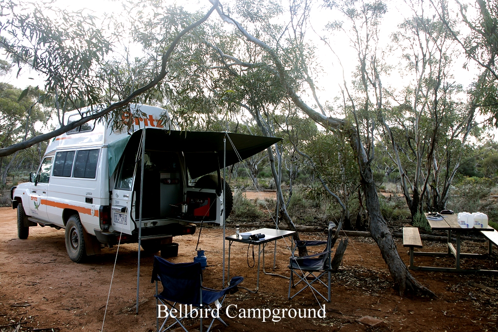 Kurz nach 6.00 Uhr wurden wir wach, blieben aber noch eine Weile in den warmen Schlafsäcken liegen. Tomoko hatte sich alles Mögliche angezogen, da ihr kalt war. Tatsächlich betrug die Temperatur im Auto nur 10°. Beim ersten Sonnenstrahl wagte ich es als erster aus dem Auto zu klettern und in den Waschraum zu gehen. Dann wieder Frühstück um 7.45 Uhr. Tomoko aß wieder Suppenreste zum Aufwärmen. Ein riesiger Schwarm Galahs, so um die 200 Vögel, kreiste kreischend über unseren Köpfen. Ein Vogel (Yellow-throated Miner) suchte auf dem Dach des Autos etwas zum Picken. Auch einige Papageien, die wir noch nicht kannten, saßen in den Bäumen. So langsam stieg die Sonne am Horizont hoch und ihre Strahlen fingen an etwas zu wärmen. Um 8.45 Uhr waren wir mit Frühstück und Einpacken fertig und fuhren los. Heute lag nur eine relativ kurze Strecke, so um die 70 km vor uns. Wir wollten in ein sehr einsames Gebiet fahren, Gluepot Reserve, dass für seinen Vogelreichtum bekannt ist. Am Ortseingang kauften wir noch ein Brot, sowie 2 Stück Kuchen und fuhren hinunter zum Fluss Murray.
