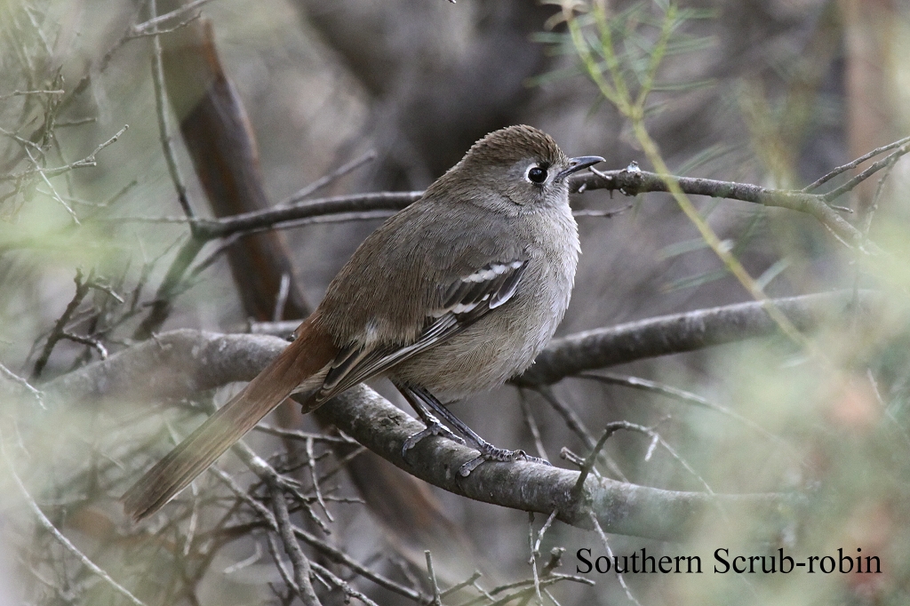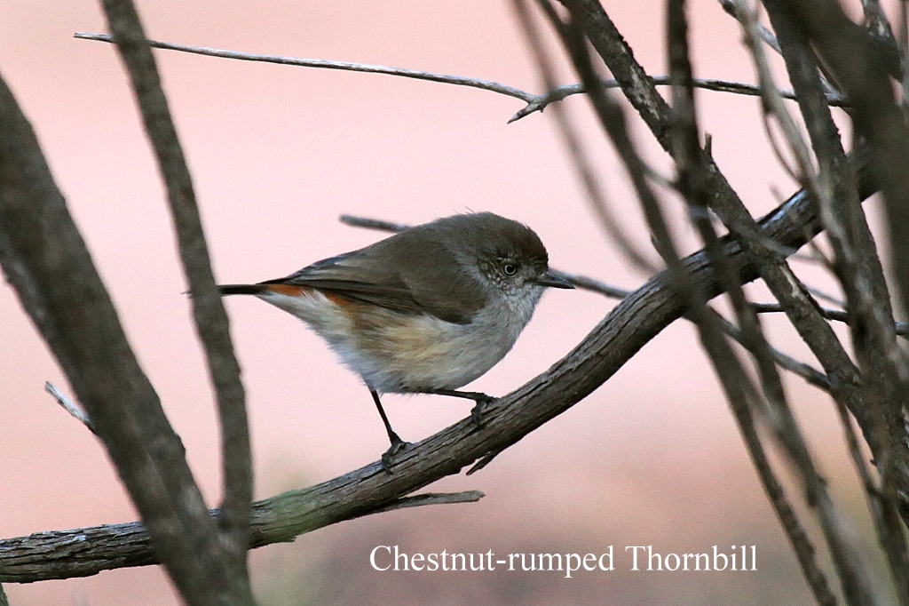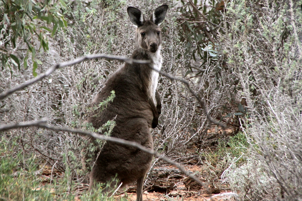Um 11.00 Uhr, nachdem wir etwa die Hälfte der Rüttelstrecke hinter uns gebracht hatten, machten wir am Straßenrand eine kleine Kaffeepause. Wir packten Tisch und Stühle aus. Die Ruhe tat wirklich gut. Wir aßen unsere mitgebrachten Muffins, die auch nach 2 Tagen noch hervorragend schmeckten. In der Ferne hüpften drei Kängurus über die Straße. Einige Vögel ließen sich blicken (Southern Scrub-robin, Spiny-cheeked Honeyeater), alle aber ziemlich scheu.