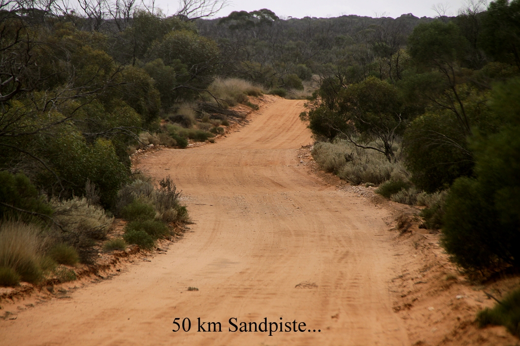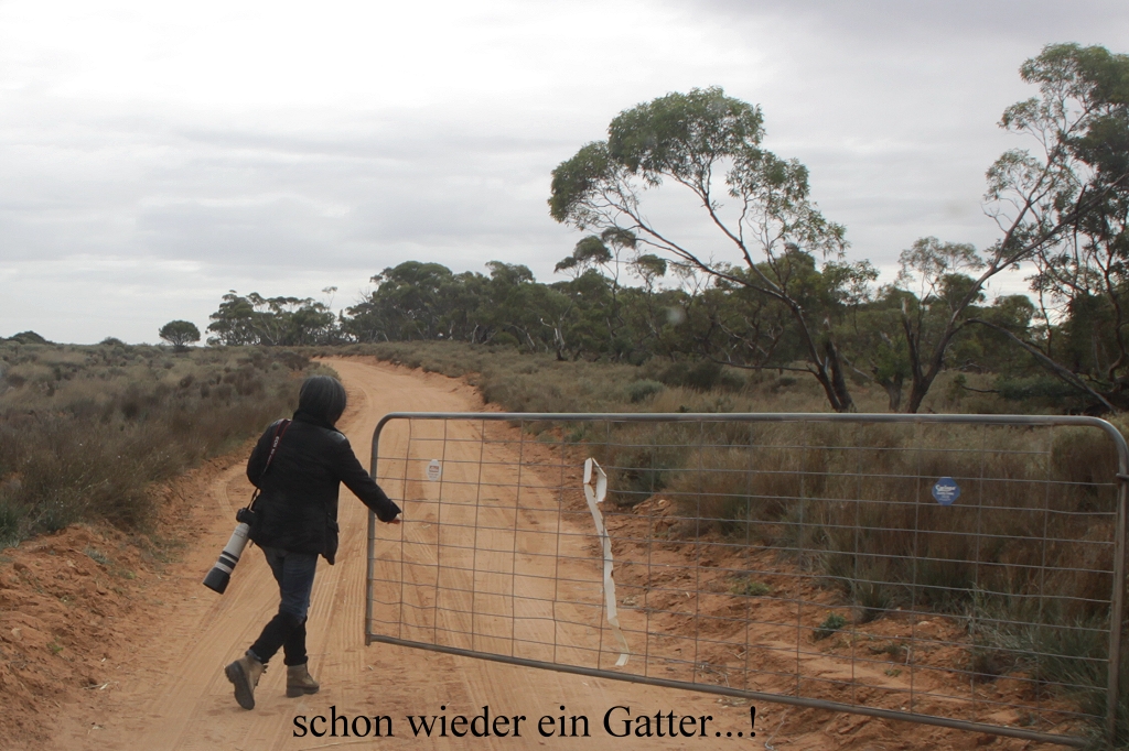 Immer wieder machten wir Halt, weil weitere Vögel unseren Weg kreuzten. Gegen 10.00 Uhr erreichten wir die Abzweigung nach Gluepot. Von hier ging eine unbefestigte rote Sandstraße über 50 km bis zum Ziel. Dies war eine erste Bewährungsprobe für unseren TOYOTA Landcruiser. Die Straße war über weite Strecken ein einziges Waschbrett und wir wurden gehörig durchgeschüttelt. Dazwischen immer wieder sandige oder sehr steinige Abschnitte, die für die grobstolligen Reifen unseres Autos aber kein Problem darstellten. Mehrmals musste Tomoko aussteigen um ein quer die Straße sperrendes Gatter aufzumachen, insgesamt 4 x, das fünfte Gatter stand offen.