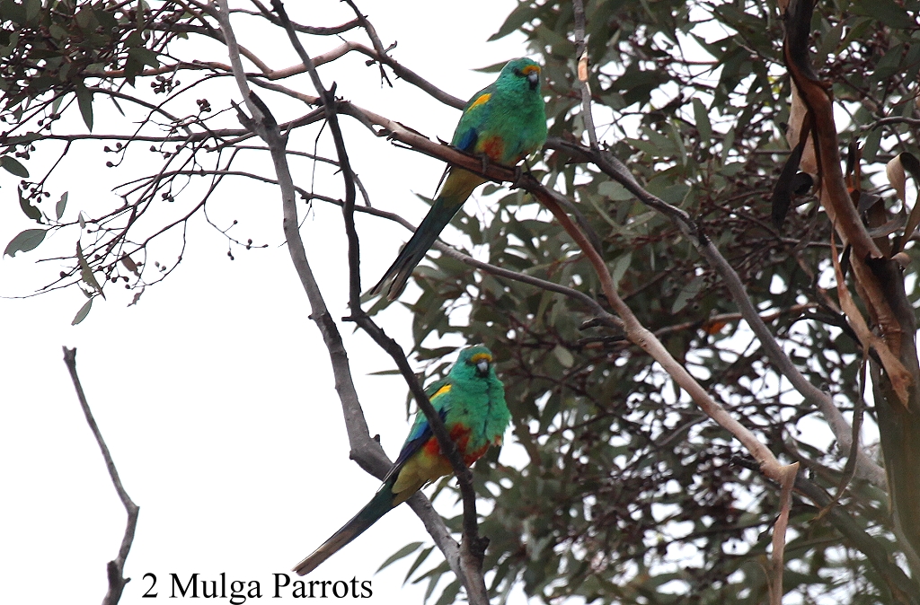 Es wurde immer windiger und wir machten uns wieder auf den Rückweg. Auf den hin und wieder auftauchenden kleinen Bänken nahmen wir immer für ein paar Minuten Platz, um die müden Beine etwas zu entlasten. Um 13.50 Uhr, nach etwas mehr als 6 km Fußmarsch, kamen wir wieder beim Visitor-Center an. Wir holten unseren aus der Bäckerei in Waikerie mitgebrachten Kuchen (Chocolate-Caramel-Schnitte) und Kaffee ( leider inzwischen kalt geworden) aus dem Auto und verzehrten beides mit großem Appetit zusammen mit unseren Bären an einem nahe stehenden Picknicktisch. Um 14.15 Uhr stiegen wir alle wieder ins Auto und fuhren den Track Nr.2 Richtung Westen bis zum Old Gluepot Dam. Nach kurzer Strecke hielten wir an, da Tomoko einen Hooded Robin gesehen hatte. Um 15.00 Uhr kamen wir am Old Gluepot an. In einer Entfernung von etwa 800 m entdeckte Tomoko 2 Emus, die ziemlich eilig am Rande eines kleinen Sees entlangliefen und nach einiger Zeit in den Büschen wieder verschwanden. Da in dem Hide in der Nähe weder was zu sehen noch zu hören war, fuhren wir weiter Richtung "Bellbird" Campingplatz. Nach ein paar km entdeckten wir 3 Mulga Parrots, ziemlich gut sichtbar in einem Baum sitzend.