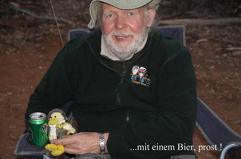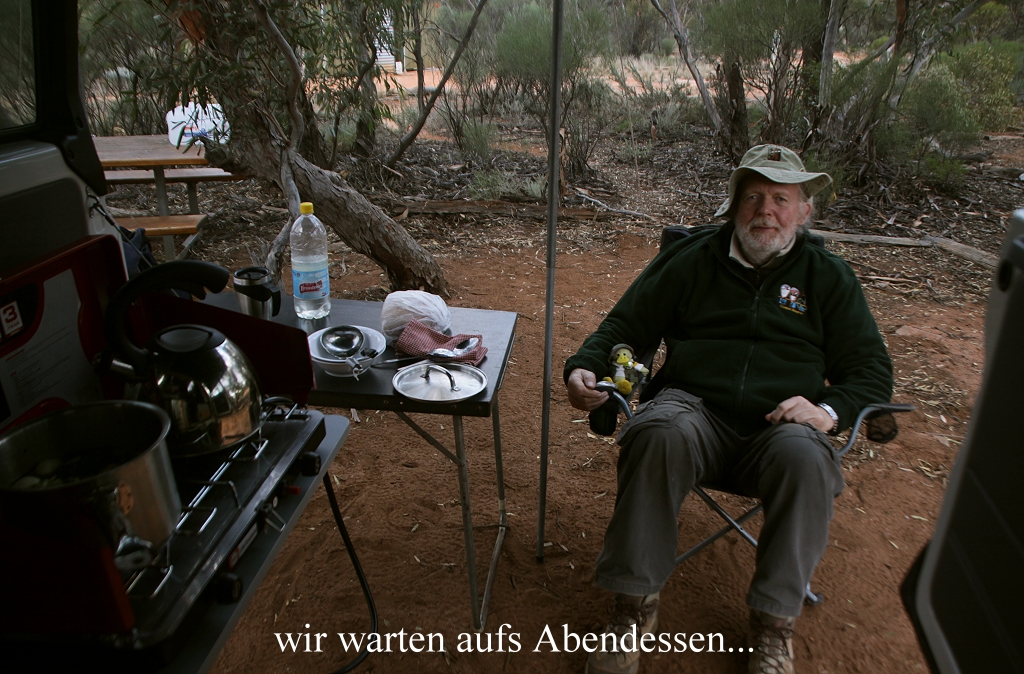 Wieder einige km weiter kreuzte ein kleiner Schwarm Babbler unseren Weg, ein Vogel, der von Birdwatchern immer wieder hier gesucht wird. Um 16.30 Uhr waren wir wieder zurück bei unserem Campingplatz. Wir waren immer noch die einzigen Gäste. Unser Auto war durch den roten staubigen Sand ziemlich schmutzig geworden.