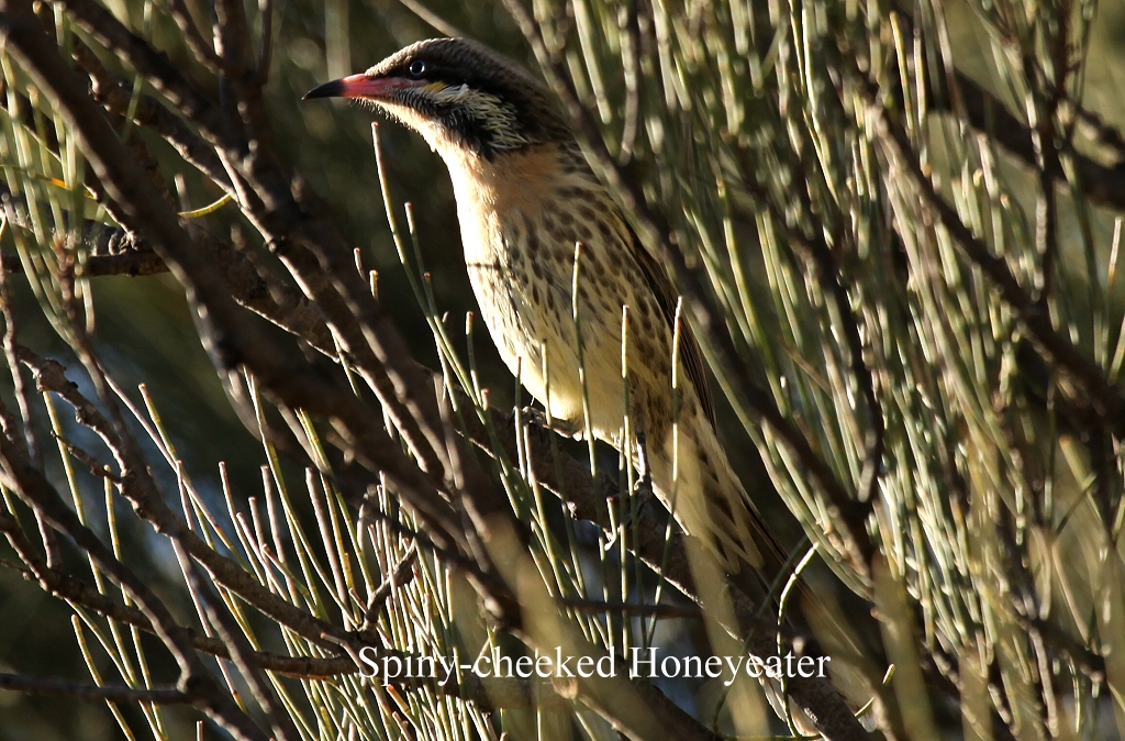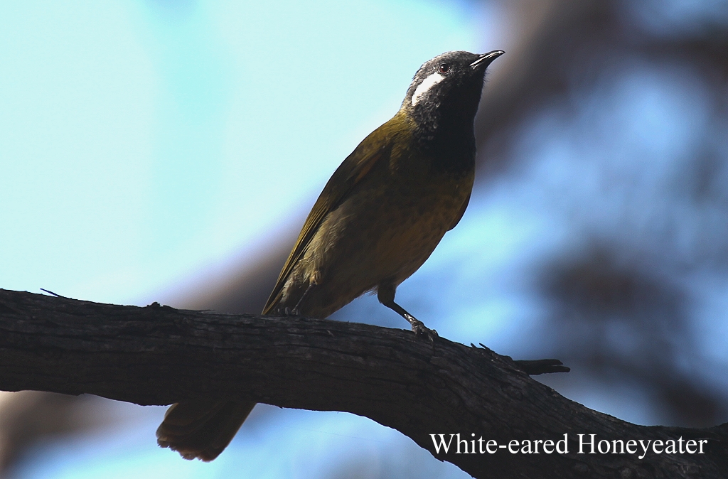 Nun marschierten wir los. Der Himmel bewölkte sich zusehends wieder. Hoffentlich zieht es nicht ganz zu so wie gestern … Dieser Trail ist eigentlich ein Rundweg. Wir gingen in etwa 1,7 km entlang. Am Ende blieben wir eine halbe Stunde auf einer Bank sitzen und beobachteten etliche Vögel, unter anderem einen White-fronted Honeyeater, ein Pärchen Red-capped Robin, Spiny-cheeked Honeyeater, Yellow-plumed Honeyeater, White-eared Honeyeater, Gilbert's Whistler.