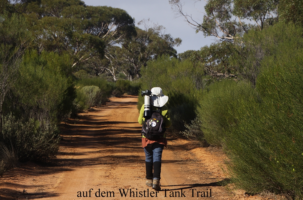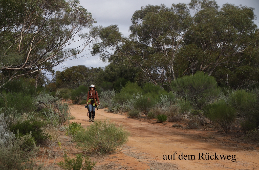 Leider sahen wir keinen Grasswren, der dem Trail seinen Namen gibt. Auch ein paar Ziegen streiften durch die Büsche. Um kurz vor 11.00 Uhr frischte der Wind wieder auf. Da die sandige Landschaft mit ihrer buschigen Eukalyptusvegetation immer gleich blieb, zogen wir es vor, den gleichen Weg wieder zurückzugehen, so dass wir anstelle von 6 km nur 3,4 km laufen mussten. Somit kamen wir um 12.10 Uhr wieder zum Ausgangspunkt zurück. In etwa 800 m Entfernung konnten wir wieder eine Gruppe Emus beobachten, so 7-8 Tiere, die langsam immer am Boden pickend durch die Landschaft zogen. Nun war es Zeit für unsere Kaffeepause mit Kuchen. Heute gab es Peacan Tarte, die wir in der Bäckerei in Waikerie gekauft hatten. Schmeckte wunderbar, meinten auch die Bären… Um 12.45 Uhr beendeten wir die Kaffeepause und fuhren nochmals zum nahegelegenen Hide zurück. Auf dem Weg dorthin sahen wir 2 Mulga Parrots und verschiedene andere Vögel.