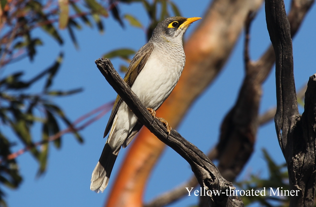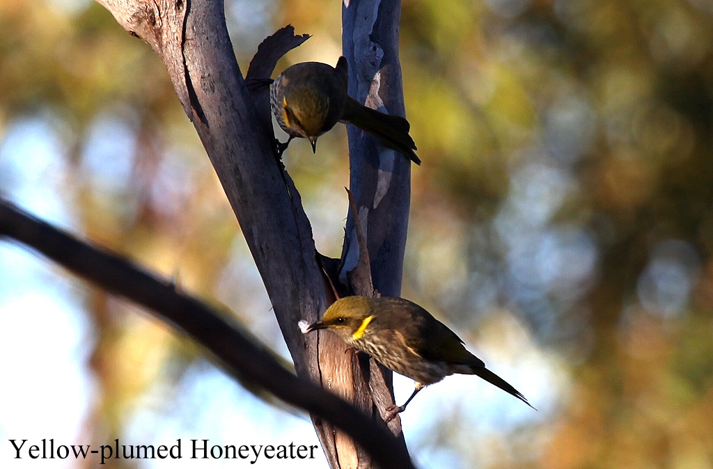 Um 8.35 Uhr kamen wir schon beim Hide-Parkplatz an. Vorsichtig gingen wir die kurze Strecke bis zum Hide und ließen uns, ohne Geräusche zu verursachen, auf einer Bank im Inneren nieder. Zwei wunderschöne Papageien (Regent Parrot) saßen in einem Baum etwa 10 m entfernt. Einer saß ziemlich ruhig auf seinem Ast, während der andere in den Zweigen herumkletterte und offensichtlich nach Früchten suchte. Vorher hatte Tomoko, die einen Augenblick früher gekommen war, einen Butcherbird gesehen. Während ich die Papageien filmte, tauchte plötzlich ein großer Schwarm (so um die 20) Miners auf. Einige waren mit Sicherheit Yellow-throated Miner, da diese sich aber auch mit Black-eared Miner paaren und es dadurch zu Hybridbildung (Mischformen) kommt, waren wir bei den anderen nicht sicher.