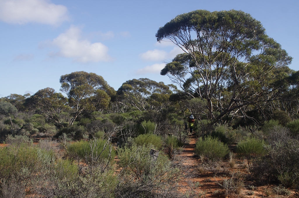 Gegen 9.40 Uhr wurde uns ein wenig kalt im Hide. Wir gingen zum Auto zurück und fuhren ein kleines Stück zurück, wo der Grasswren Trail abzweigte. Hier kamen wir um 9.50 Uhr an. Als wir ausstiegen, sah ich in etwa 500 m Entfernung, wie sich ein langer Hals mit Schnabel durch das niedrige Buschwerk bewegte. Beim näheren hinsehen erkannte ich, dass dort ein Emu herumspazierte, leider zu weit für ein Foto.