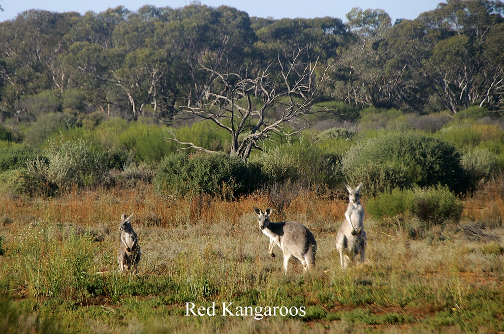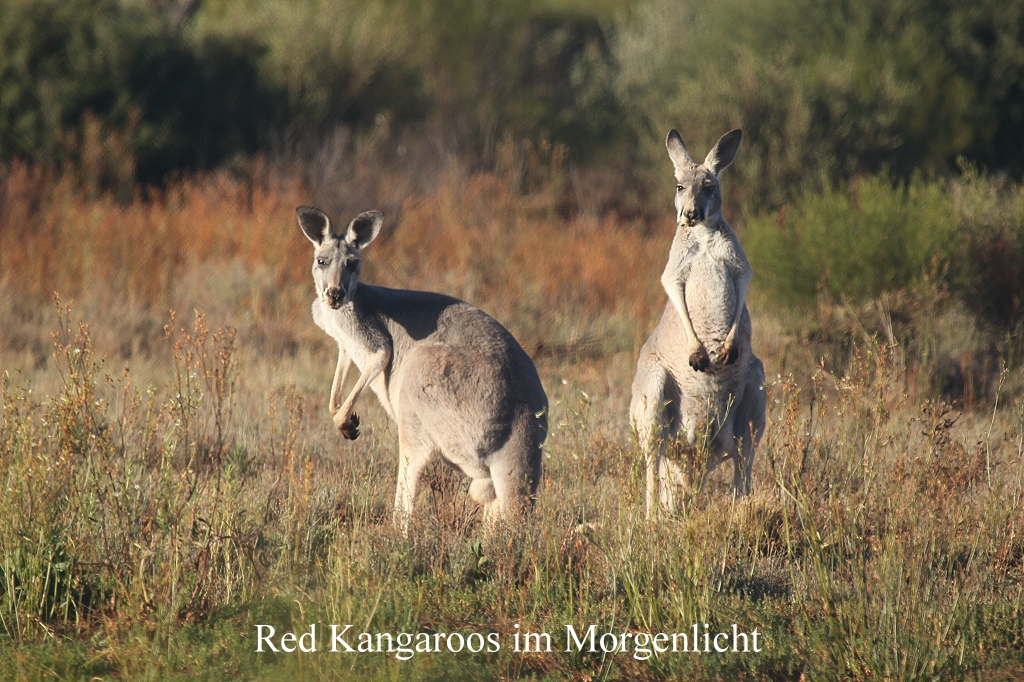 Der Tausch unserer Liegeplätze in dieser Nacht hatte sich bewährt. Weder Tomoko noch ich hatten gefroren. Meine neue Fleece-Jacke diente Tomoko als zusätzliche Decke, und ich hatte keinerlei Probleme an der kalten Außenwand des Autos. Es war auch nicht ganz so kalt wie gestern im Auto, immerhin zweistellige 11°. Ich kletterte um kurz vor 7.00 Uhr auf den Fahrersitz, startete den Motor und schaltete die Heizung ein. Obwohl ich wartete, bis der Motor auf Touren kam und warme Luft ins Innere blies, sank die Temperatur im Auto auf 10°. Das lag ja wohl nicht in meiner Absicht. Also machte ich den Motor aus und installierte stattdessen den Gaskocher im Inneren. Schnell einen Topf mit Wasser für Tee und Kaffee aufgesetzt und schon wurde es angenehm warm. Wir frühstückten gemütlich ein Käse- und ein Honigbrot. Um 7.50 Uhr waren wir mit dem Frühstück fertig. Bis wir dann mit Toilette, Zähne putzen, Spülen, Markise abbauen usw. fertig waren, war es fast schon 8.30 Uhr. Nun ging's aber endlich los. Die tiefstehende Sonne strahlte schon vom wolkenlosen Himmel, hatte aber noch keine so richtige Kraft um die kalte Luft aufzuwärmen. Zunächst fuhren wir Richtung Hide am Grasswren Tank nicht weit von unserem Campingplatz (ca. 2 km). Gleich nach ein paar hundert Metern entdeckte ich etwa 200 m vom Fahrweg entfernt 3 Kängurus, offensichtlich Red Kangaroos, die uns aufmerksam aus der Ferne beäugten.