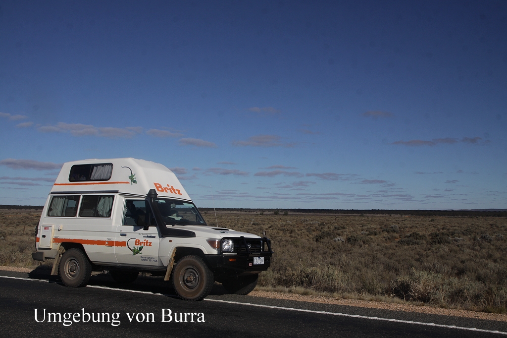Nun ging es weiter Richtung Burra, einem weiteren kleinen Ort auf der Strecke zu den Flinders Ranges. Auf den 85 km gab es keinerlei Ansiedlung, bzw. Tankstelle oder ähnliches, nur Schafe. Auch der Verkehr war äußerst dünn. Um 14.30 Uhr tauchten in einiger Entfernung 2 Emus auf. Die weißen Wolken am blauen Himmel sahen aus wie lange Baguettes, sehr merkwürdige Formen. Je weiter wir fuhren, umso weniger wurden sie, bis nach einer Weile nur noch blauer wolkenloser Himmel zu sehen war. Die Luft blieb trotzdem kühl. |