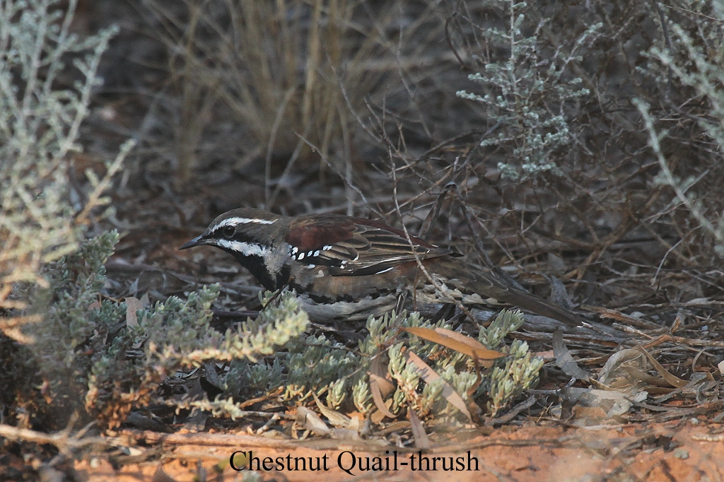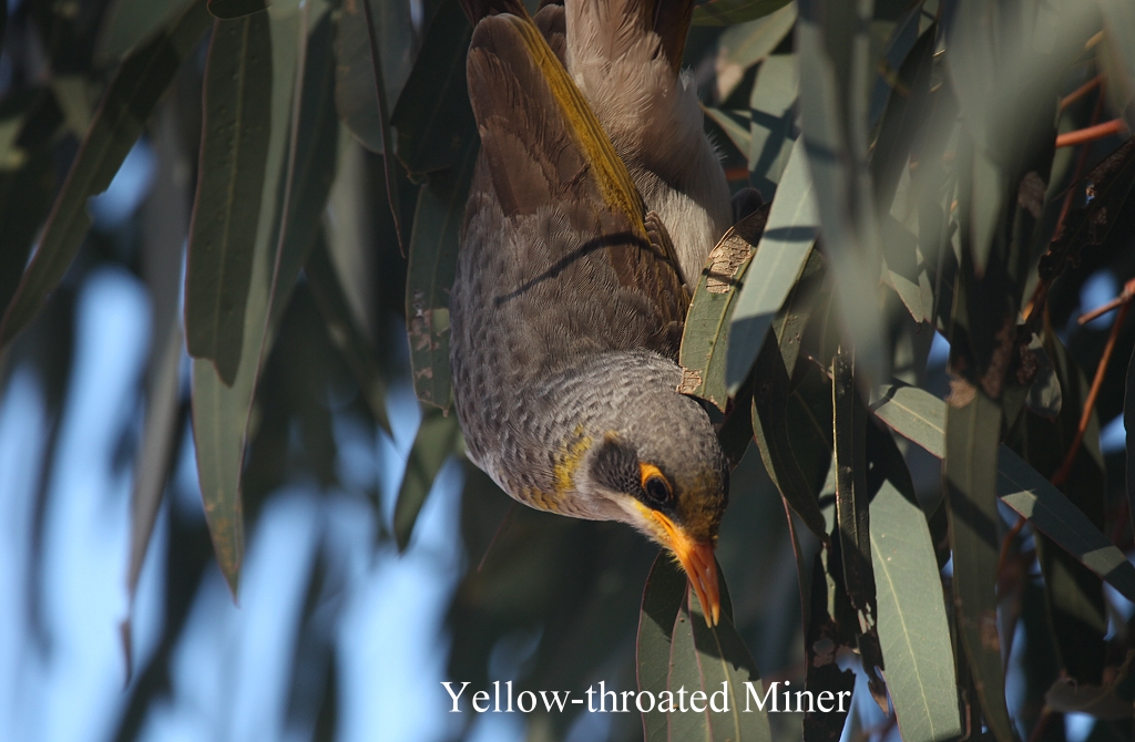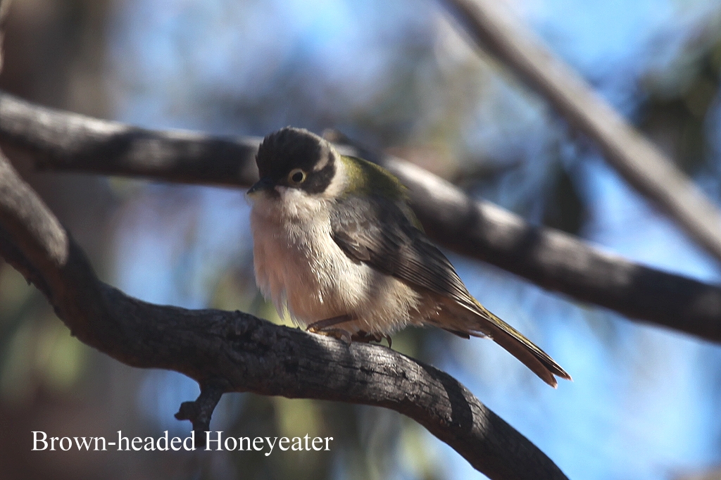 Nun fuhren wir zu unserem Campingplatz zurück, luden die restlichen Sachen ein (Campingmöbel, Markise mit Stangen, Wasserkanister) und begaben uns um 9.50 Uhr auf die Weiterreise. Kaum waren wir losgefahren, hüpfte auch schon ein Känguru auf den Weg. Tomoko meinte, dass es ein Euro (eine Känguru-Art, kein Geld) war. Insgesamt sahen wir 4 Kängurus, kann aber auch immer das gleiche Tier gewesen sein, das parallel zum Fahrweg durch die Büsche hüpfte, wer weiß… Ein Stück weiter auf Track 7 kreuzte ein Schwarm Babbler mit ihren typischen lauten Stimmen unseren Weg. Wir stiegen aus und konnten auch noch einige andere Arten beobachten, u.a. White-browed Babbler, Brown-headed Honeyeater, |