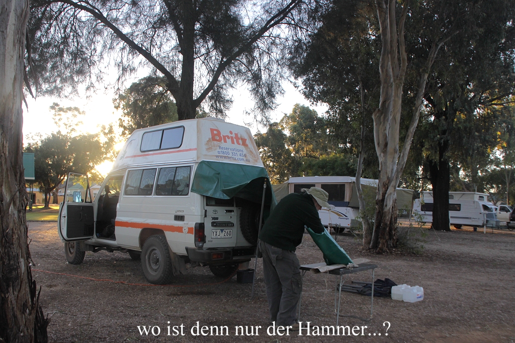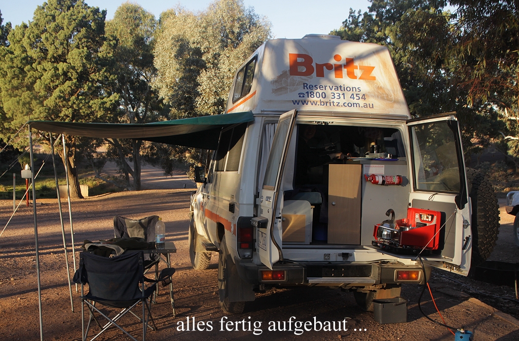 Um 15.40 Uhr kamen wir nach weiteren 4 km am Caravan-Park an. Obwohl der Platz gut besucht war, gab es noch etliche freie Plätze. Wir bekamen einen Platz mit Strom- und Wasserversorgung für 33,- $ pro Nacht. Da wir nicht wussten, wie lange wir bleiben wollten, buchten wir erst mal nur für 2 Nächte. Morgen schauen wir uns dann mal um, besonders der Wilpena Pound ist auch eine Alternative. Ich baute wie immer alles auf, wobei Entelchen mir diesmal half... |