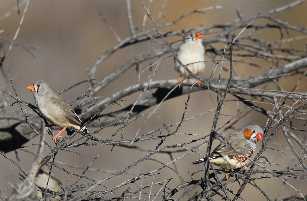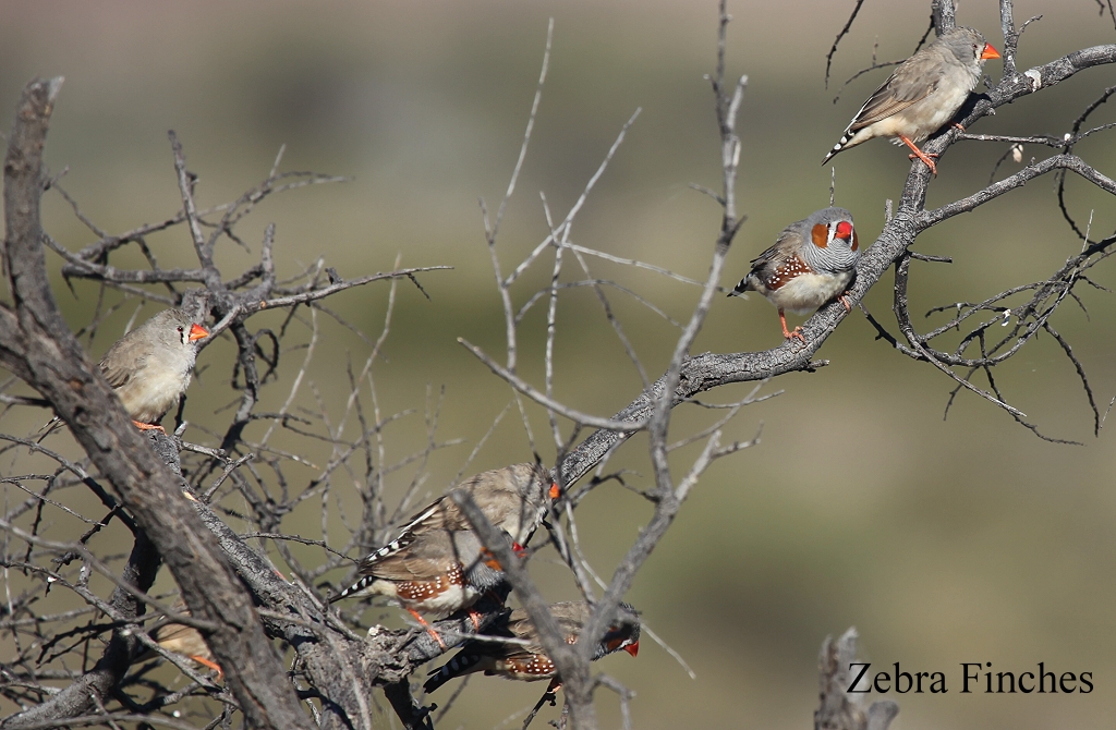 Endlich erreichten wir um 14.05 Uhr Hawker, den letzten Ort vor den Flinders Ranges. Hier, so hatte ich im Internet gelesen, sollte man sich noch mit Lebensmittel-Vorräten eindecken können. Als wir aber den einzigen kleinen Laden, der an eine Tankstelle angeschlossen war, inspizierten bekamen wir doch einen gehörigen Schrecken. Es gab so gut wie nichts hier, und das wenige was es gab war vollkommen überteuert. Wir kauften ein schlabberiges Toastbrot und ein kleines Stück Käse, und das für 10,- $. Eine einzelne Avocado sollte 4 $ kosten. Ich weiß nicht, was sich dieser Informant im Internet mit seinem Tipp gedacht hat, hier seine Lebensmittelvorräte aufzustocken ist ja verrückt….Tomoko überlegte fieberhaft, wie viele Tage sie mit den noch bei uns vorhandenen Lebensmitteln auskommen kann. Nach einigem hin und her stellten wir fest, dass wir wohl noch einige Tage hinkommen. Wenn es gar nicht mehr geht, müssen wir ein Stück zurückfahren, eventuell bis Quorn oder aber sogar bis Port Augusta, mal sehen… Wir fuhren etwas besorgt weiter, wurden aber bald entschädigt, als direkt neben der Straße ein großer Schwarm von kleinen Vögelchen auftauchte. Beim näheren hinsehen stellten wir fest, das es sich um Zebrafinken (Zebra Finch) handelte, die mit ihren roten Schnäbelchen teils auf der Straße sitzend, teils in den trockenen Büschen nach Futter pickten. |