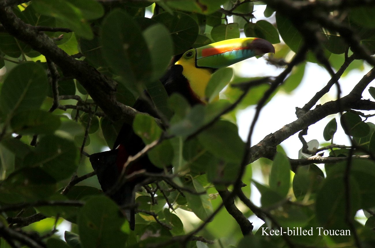 Doch plötzlich überschlugen sich die Ereignisse. Etliche Kapuziner-Äffchen turnten hoch durch die Baumwipfel. Ich hörte einen Vogelruf, der mir bekannt vorkam. Während ich noch krampfhaft überlegte, wem diese Stimme gehörte, zeigte Tomoko plötzlich hoch in die Kronen der Bäume. Sie hatte doch tatsächlich 2 Tukane (Keel-billed Toucan) entdeckt. Die beiden suchten dort oben nach Beeren, die sie geschickt hochwarfen und dann mit ihren gewaltigen Schnäbeln wieder auffingen, ein tolles Erlebnis. |