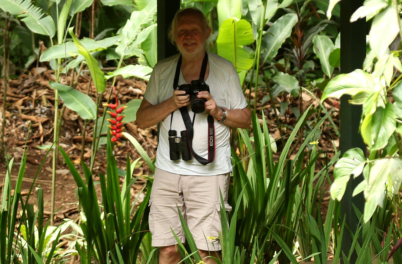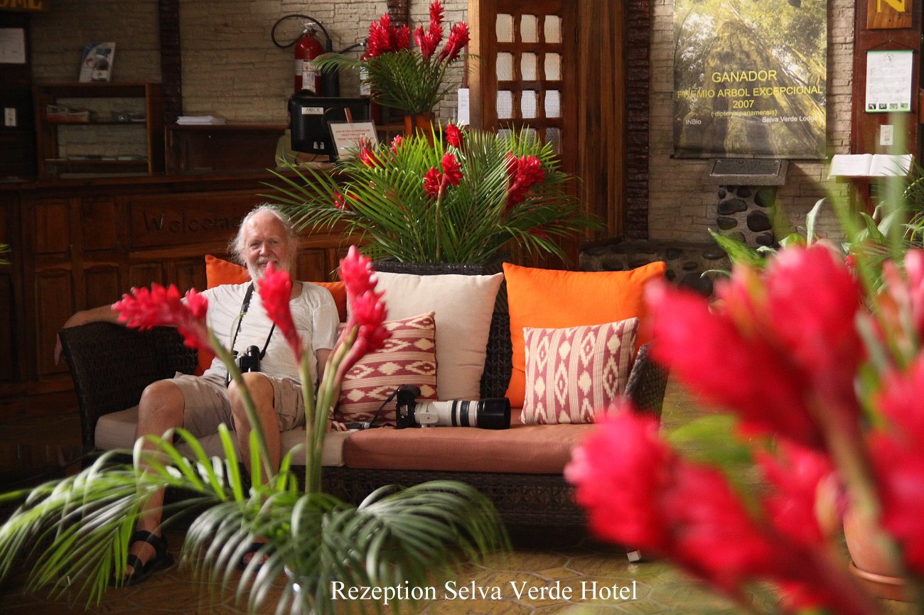 Da wir Hunger hatten, aßen wir das Gebäck, das wir schon gestern gekauft hatten. Ein kleines süßes Gebäckstück nahm ich mit zum nahen Restaurant, wo es für Gäste kostenlos Kaffee und Tee gab. Als ich zurückkam, stand Tomoko gerade unter den Bungalows, die ja auf hohen Stelzen gebaut sind, und fotografierte zwei große Iguanas, die sie gerade dort entdeckt hatte. Auch einen Great Kiskadee sowie einen Specht (Northern Barred-Woodcreeper) hatte sie fotografiert. |