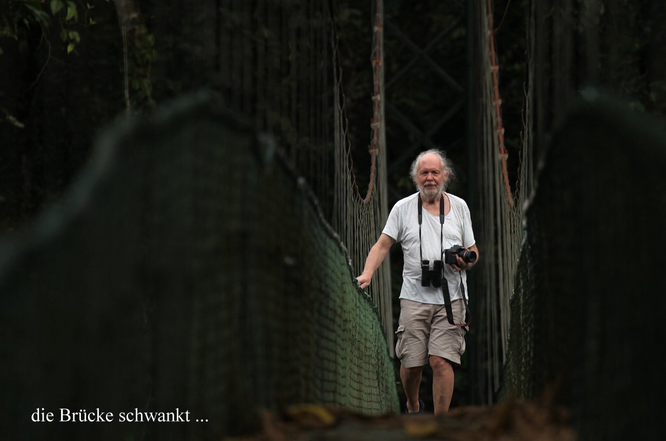 Als ich Tomoko von der Möglichkeit erzählte, im Restaurant Kaffee zu trinken, machten wir uns beide nochmal auf den Weg dorthin. Nach dem Kaffee gingen wir mal auf die Hängebrücke, die hier über den Rio Sarapiqui gespannt ist. Die Konstruktion ist ziemlich schwankend und Tomoko bekam schon Angst. Da kam ein großer Vogel herangeflogen und blieb auf einem nahen Baum sitzen. Es war ein prächtiger Chestnut-mandibled Toucan, den wir zum ersten Mal sahen. |