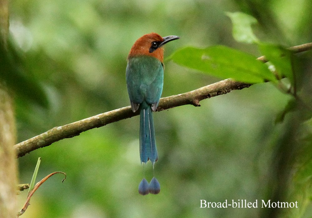 Da es plötzlich leicht zu regnen anfing, gingen wir schnell zurück. Bei dem überdachten Weg angekommen entdeckte ich einen Robin und gleich darauf einen heranfliegenden weiteren Vogel, der auf einem Ast sitzen blieb. Es war ein wunderschöner Broad- billed Motmot mit zwei langen Schwanzfedern. |
