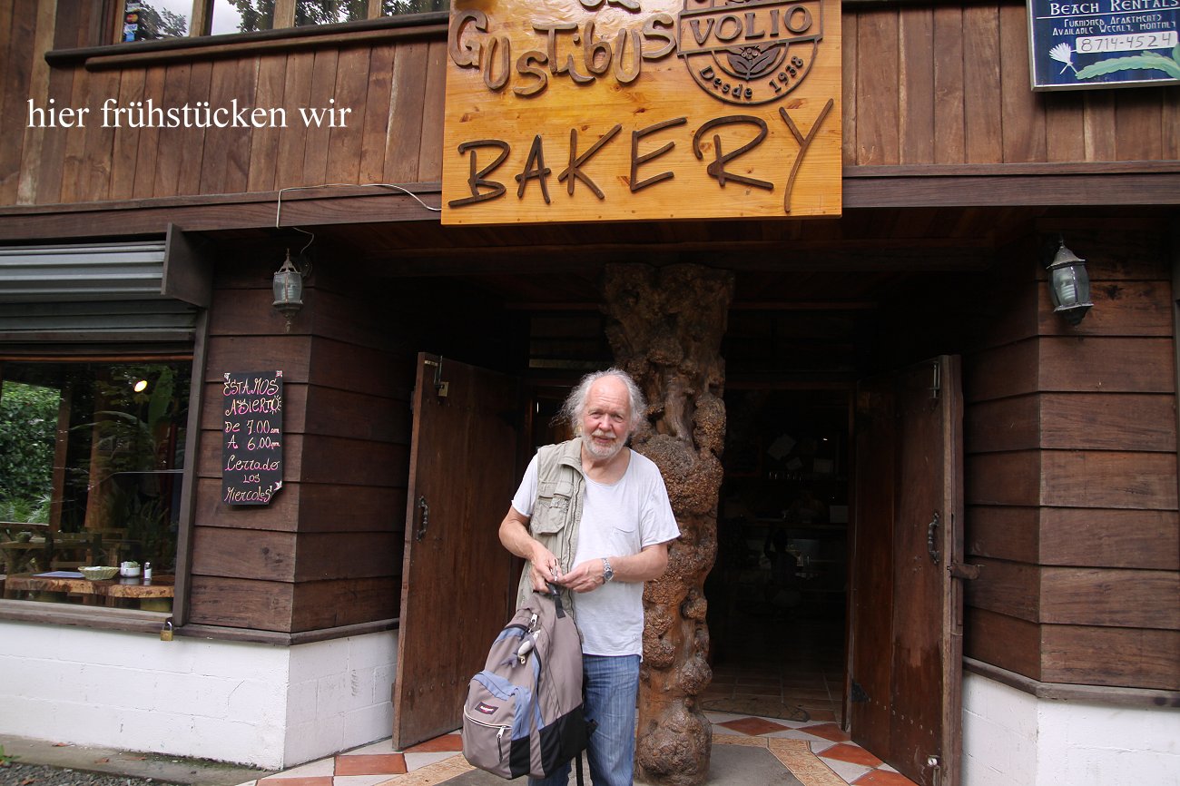 Die ganze Nacht regnete es Sturzbäche vom Himmel. Als wir aber gegen 5:45 h wach wurden, hatte der Regen aufgehört. Das Dach des Bungalows hatte dem starken Regen wohl nicht ganz Stand gehalten, denn am Boden zeigte sich eine kleine Pfütze und Tomokos Rucksack war nass geworden. Um 6:00 h standen wir auf und packten die Koffer. Um 7:00 h hatten wir alles im Auto verstaut und fuhren zu einem nahen Café um dort Kaffee zu trinken. Das Frühstück dort war sehr gut und mit 9300 Colones (ca. 12,- €) auch ziemlich preiswert. Wir blieben gemütlich sitzen bis 8:00 h. |