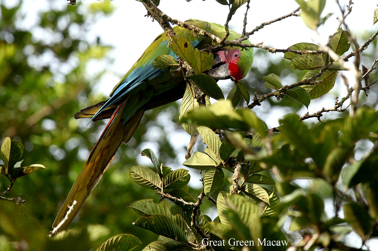 Irgendwann gingen wir zu unserem Zimmer zurück. Eigentlich wollte ich dort ein wenig ausruhen, doch krächzende Stimmen aus der Nähe ließen uns aufhorchen. Da saßen doch tatsächlich wieder einige dieser großen grünen Papageien, großer Soldatenara (Great Green Macaw) genannt, hoch in einem Baum. Einer versuchte, mit seinem Schnabel, harte bohnenähnliche Früchte abzubeißen. Ich holte schnell meine Videokamera und nahm die Szene auf. |