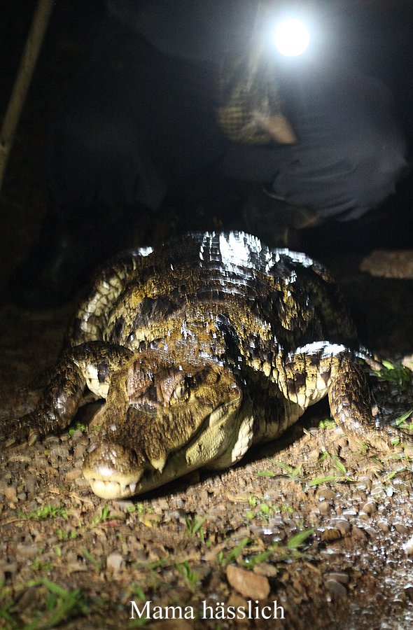 Nach dem Essen versammelten sich die 8 Gäste der Lodge, alle Deutsch sprechend , zu einem kleinen Nachtspaziergang den Weg zur Lagune hinunter. Unser Führer Henri rief in die Dunkelheit verschiedene Namen wie „Eva“, „Aggressivo“, „Mama Hässlich“ usw. und plötzlich kamen von verschiedenen Seiten Kaimane aus den Sümpfen den Weg hinauf uns entgegen gekrochen. Ihre Augen leuchteten gespenstig im Licht der Taschenlampen. |