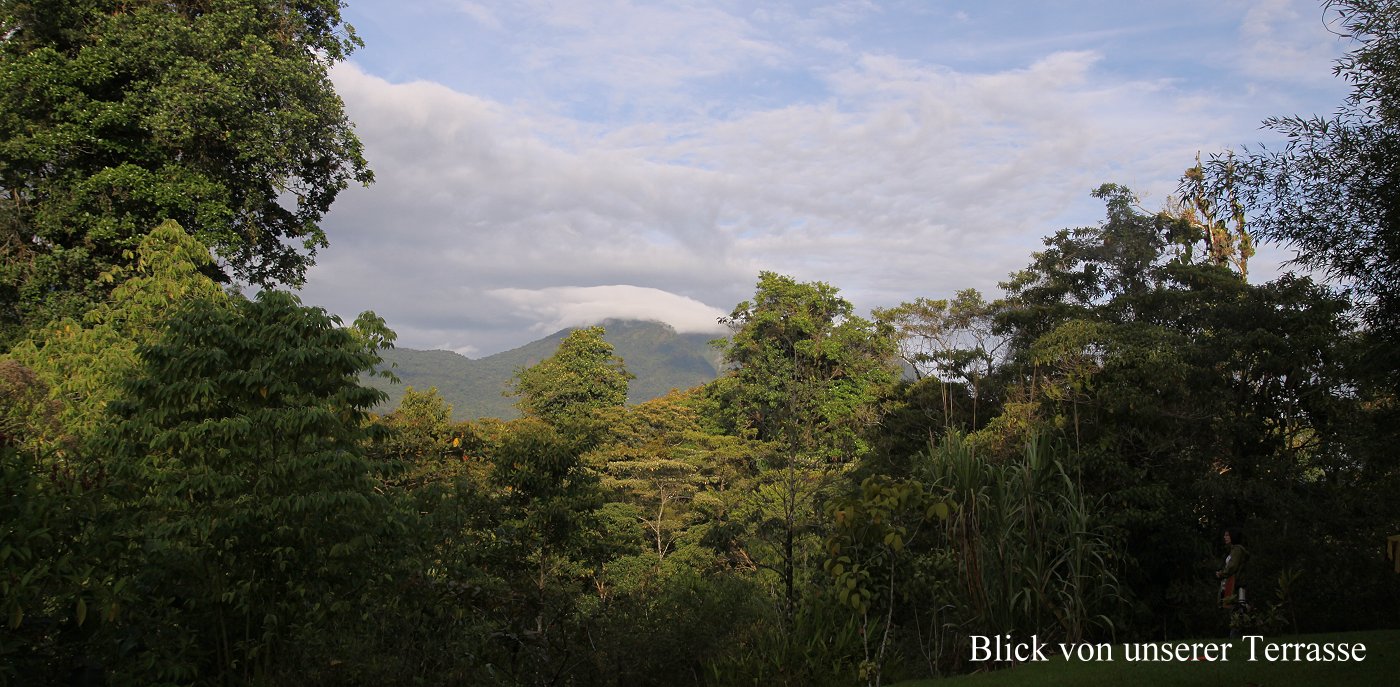 Wir gingen zur Rezeption, wo Kurt, ein Deutscher, dem die Anlage gehört, uns begrüßte und uns einiges Wissenswerte rund um die Lodge erklärte. Mit einem Kaffee setzte ich mich auf die große Terrasse. Auch hier waren Bananen für die Vögel aufgehängt. Was hier innerhalb kurzer Zeit an Vögeln , einer schöner als der andere, zu sehen war, war einfach unbeschreiblich. Wir wussten gar nicht, wohin wir zuerst schauen sollten, soviel war zu sehen. |