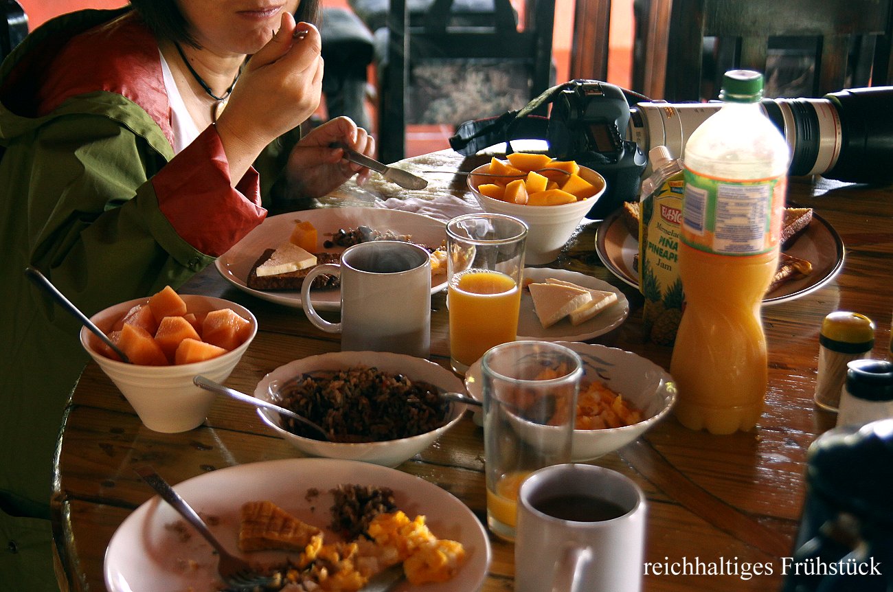 Auf einmal fiel eine Bohnenschote zu Boden und der Papagei flog ärgerlich krächzend davon. Gegen 16:30 h gingen wir beide zum Zimmer zurück. Tomoko sortierte ihre bisher heute gemachten Fotos, es waren über 500...! Ich fing derweil schon mal an Tagebuch zu schreiben. So langsam brach die Dämmerung an und das Grün des undurchdringlichen Dschungels wurde dunkler. Zahlreiche Grillen zirpten und etliche andere unbekannte Laute drangen zu uns. Um 18.30 h gab es Abendessen. Ein kleines schmackhaftes Buffet war vorbereitet. Tomoko bekam extra sogar ein vegetarisches Gericht. Zur großen Freude von Entelchen trank ich ein Bier zum Essen. |