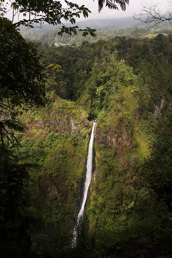 Der Pfad endete an einer Stelle, wo man einen herrlichen Ausblick auf einen am gegenüberliegenden Hang herabstürzenden Wasserfall hatte. Nach einigen Fotos machten wir uns wieder auf den Rückweg. Dabei kam ich ganz gehörig ins Schnaufen. Immerhin waren wir auf 1000m Höhe, nicht besonders hoch, doch es reichte... Am Auto angekommen war mein Hemd klatschnass verschwitzt. |